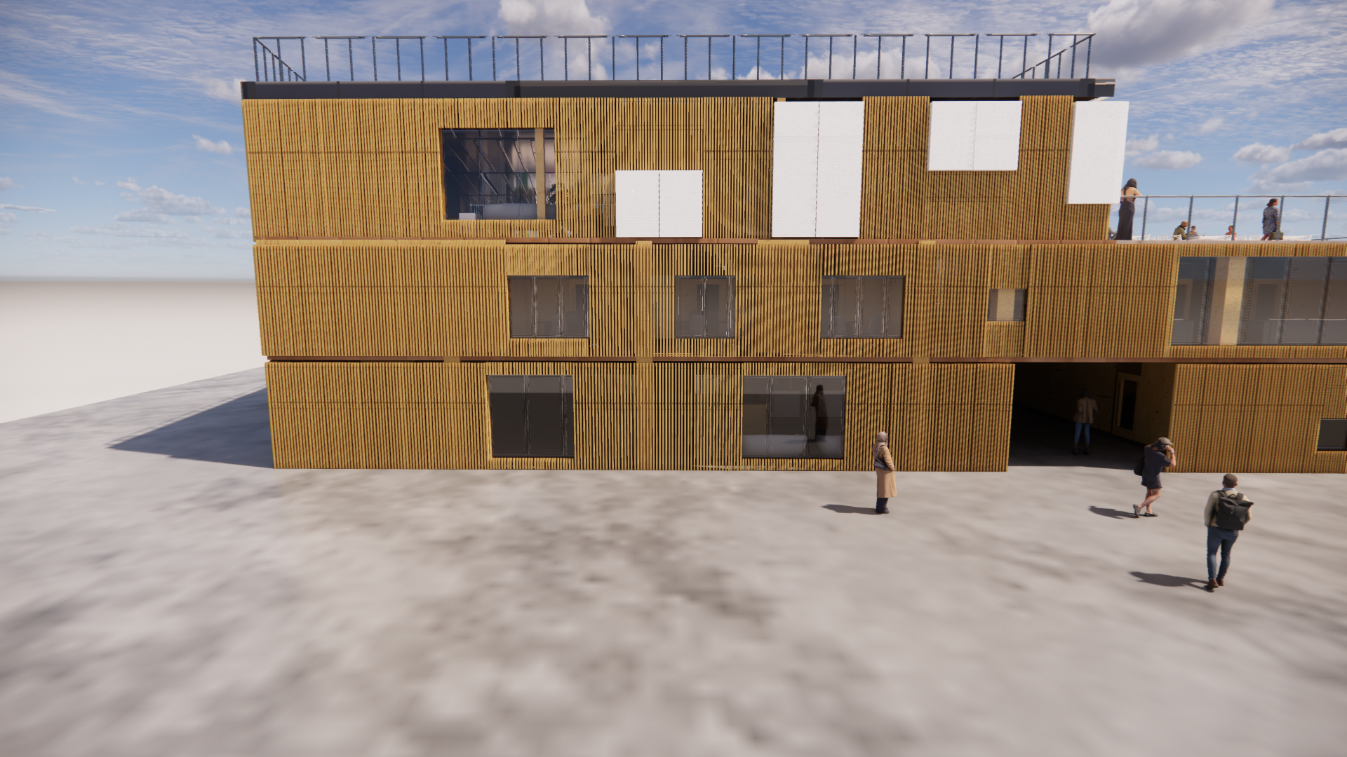 modernist exterior shot the white area are bonded bricks i wanted to show box brick box elements the rest are windows and the facade is mainly vertical timber strips architecture