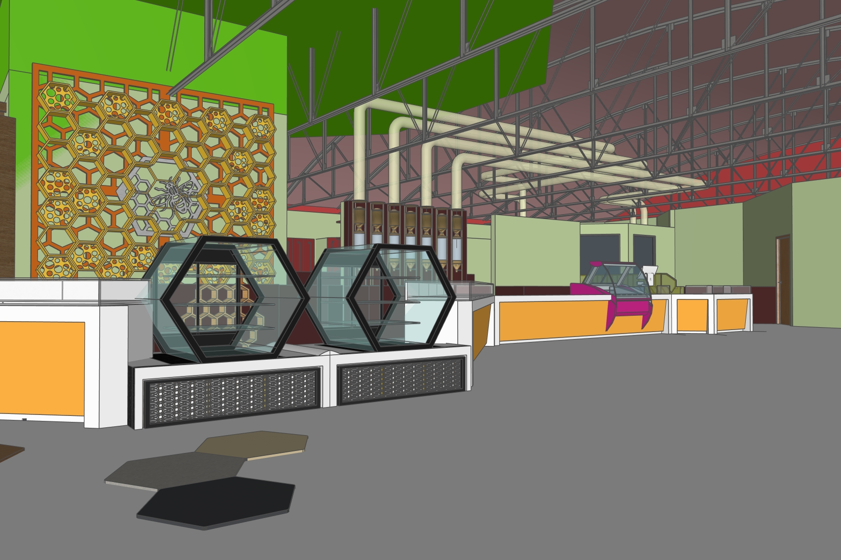 transform image to a high end spice shop with warm golden hour atmosphere soft glowing lighting and relaxed upscale energy same spatial configuration put coffee bean tubes where white is in the input image