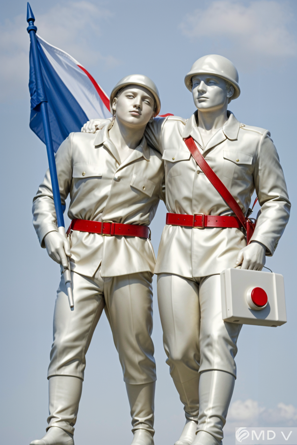 nordic exterior shot statue of two soldiers made of plastic futurism in white red and blue colors russian architecture