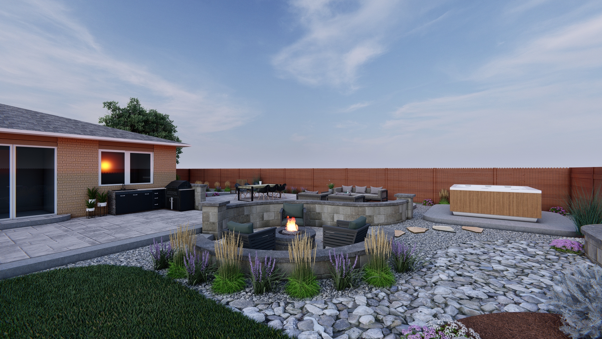 outdoor patio at sunset modern and serene single story brick house with large windows reflecting the warm orange glow of the setting sun backyard features a sleek outdoor kitchen with black cabinetry and grill central focus on a circular stone fire pit with gentle flames surrounded by stylish dark chairs lush green grass and vibrant purple flowers in the foreground a light stone path winds through a zen garden with small pebbles leading to a wooden hot tub with clean white accents earthy tones throughout with a light blue sky and soft clouds creating a peaceful atmosphere