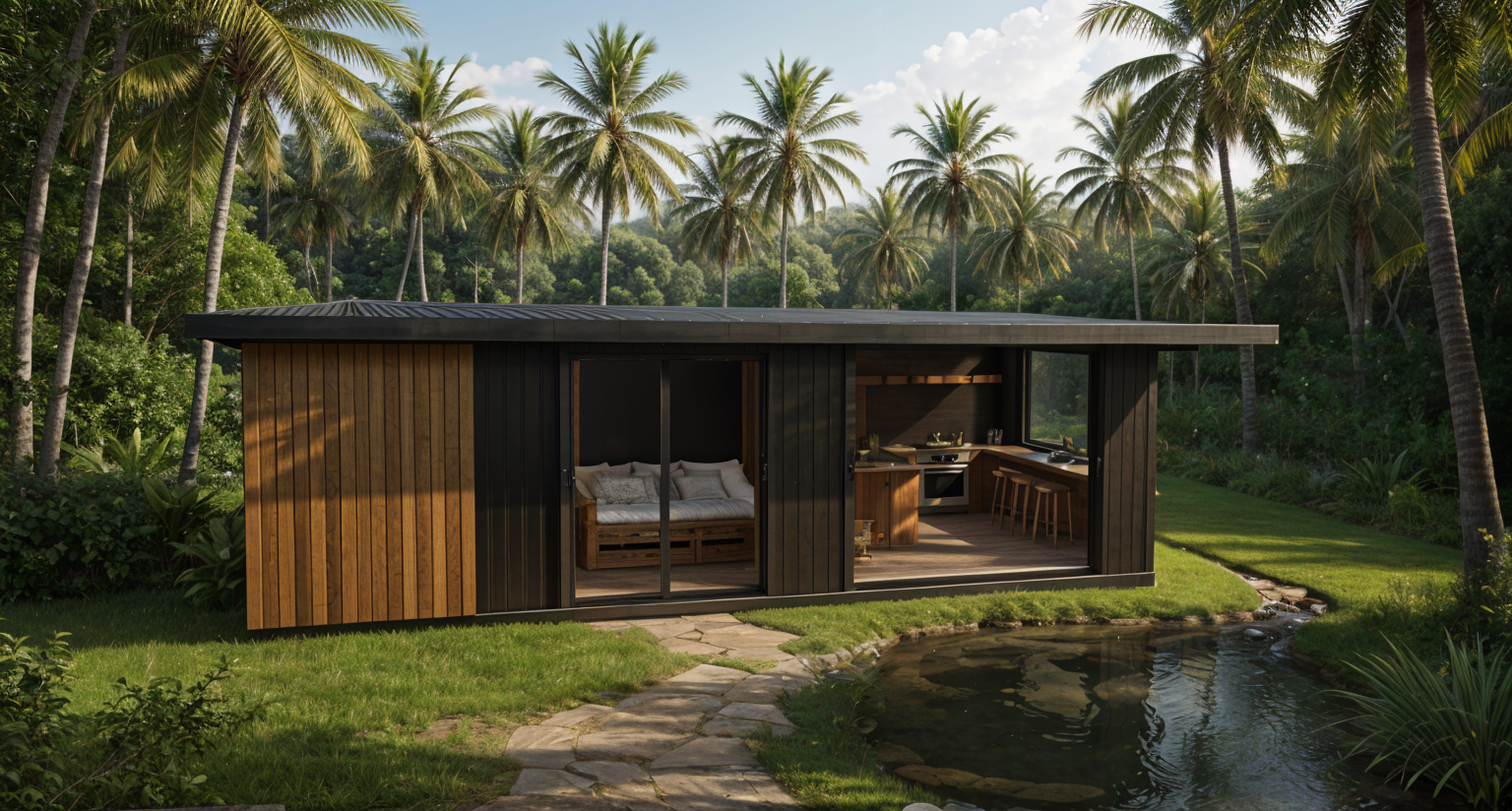 exterior shot render a charming countryside cottage with a gabled roof use warm soft beige for the exterior walls contrast with dark brown wooden trims the roof is covered with textured gray shingles black windows and a welcoming front door painted in black the brick foundation painted white surround with lush greenery vibrant flowers and a gentle golden sunset casting a cozy serene atmosphere