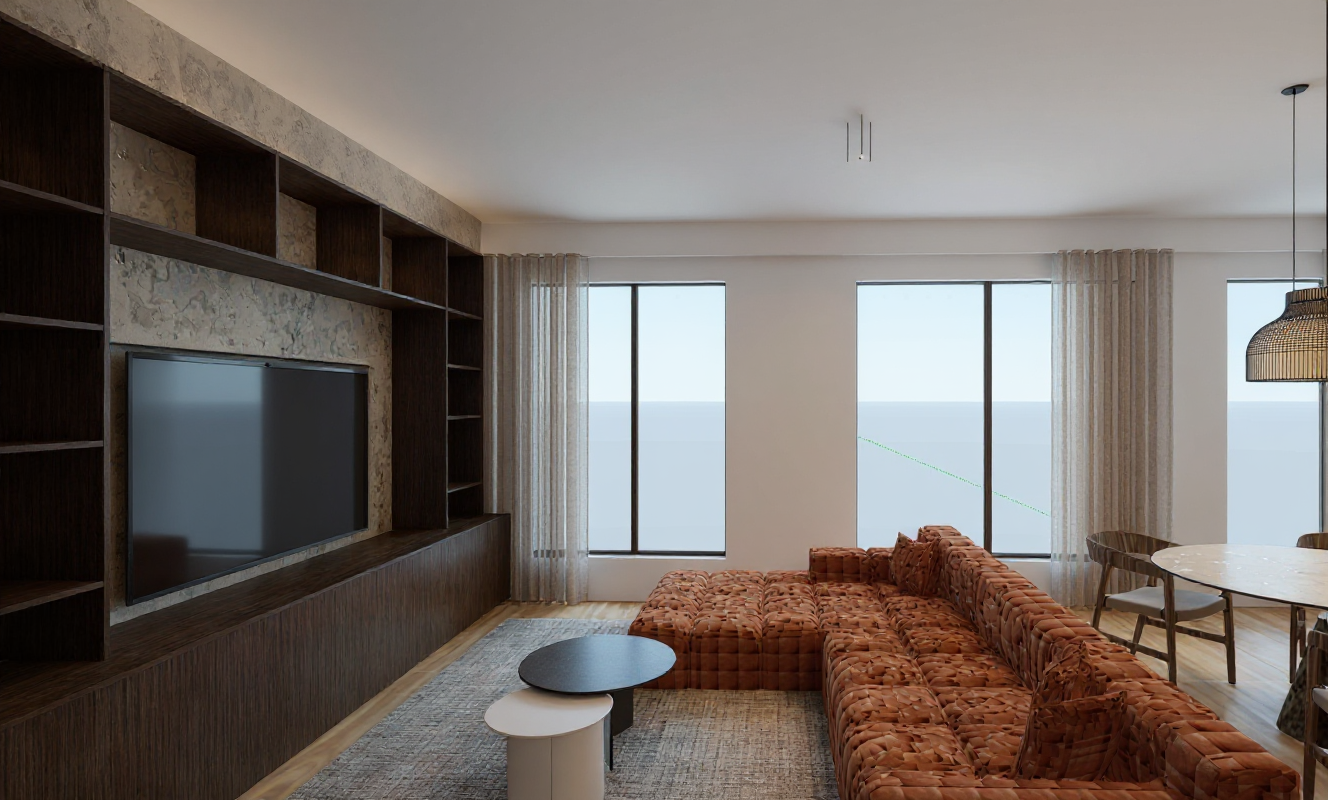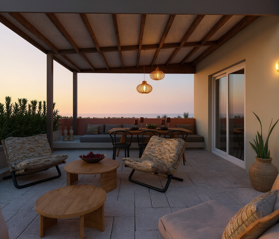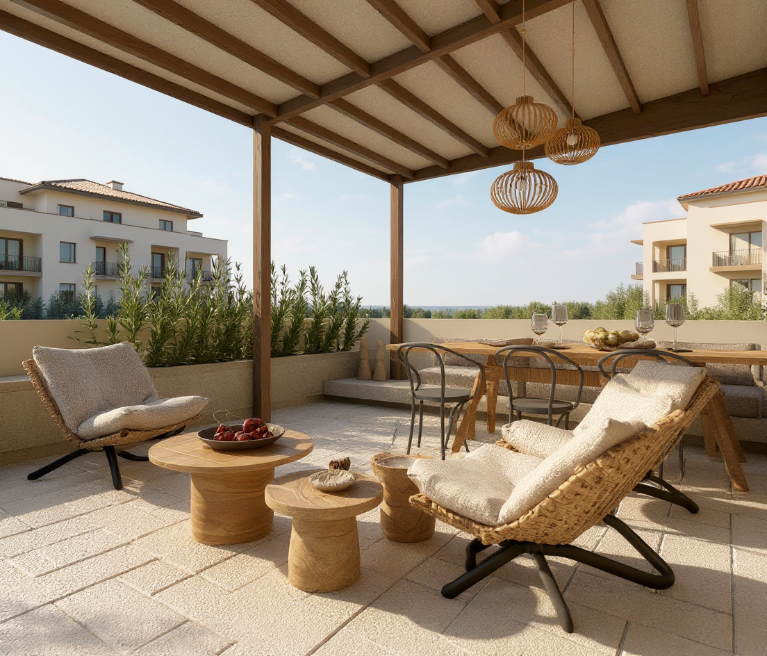 a serene outdoor space under a modern pergola three pendant lights with boho style cast a warm glow the table is set elegantly with wine glasses and a meal sleek black chairs surround the table adding contrast a cozy earth toned sofa invites comfort lush green plants peek out from behind the table enhancing the natural feel the sky transitions from soft pastel pink to light blue with a view of other apartments and greenery creating a tranquil evening atmosphere warm neutral tones dominate the space evoking a sense of relaxed sophistication the veranda is on the 3rd floor high resolution render with daylight only