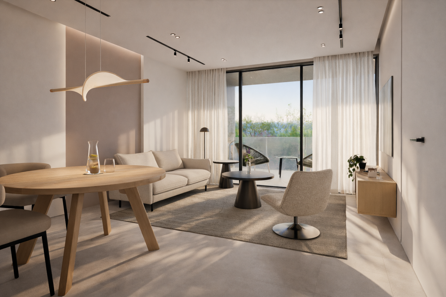 create hyper realistic architectural visualizations in 8k resolution every object furniture fixtures and architectural elements must remain in its place the layout of the space must remain unchanged the warmth subtle reflections soft shadows richer colors and luxury level realism enhance the sense of depth and realism through the richness of the wood grain the sheen of brass the texture of fabrics and the clarity of polished surfaces while the entire scene remains exactly as it was originally designed the lighting is that of a bright summer morning with sharp shadows on the walls and floor on the table is a middle size bonsay flower sofa are two cylindrical cushions made of missoni fabric on the armchair is a less big cilindrical pillow than ont he sofa upholstered by an other missoni fabric on the round low table lies an open andy warhol photo album next to it a decorative ittala glass bowl filled with limes remove the glass vase and the purple flower in the picture on the left side is a dresser stands a small modernist bust made of white plaster the rug is from the collection of the manufacturer nordic the type of notes rug the same size as same as the rug in the original photo the grout lines of the flooring are subtly visible on the wall behind the sofa is a rectangular part is pastel warm middle dark taupe colored features subtle hidden lighting along its two edges on the right side of the the taupe colored rectangle is a paint by this link https kavehome com hu en p olvin abstract picture on white recycled paper with hand crafted reliefs 104 x 124cm on the balcony delete the two original green armchairs the lighting is that of a bright summer morning with sharp shadows on the walls and floor a transparent glass railing runs along the edge of the terrace through which the cypriot coastline is visible along with distant vegetation typical of the greek climate and sunshine on the terrace are three ethimo pathio armchairs two facing the viewpoint with their backs at an angle toward the viewer featuring white boucl fabric seat and back cushions on top of them are two decorative cylindrical cushions made of different bluish green missoni fabrics under the armchairs is an ethimo nodi rug in front of the armchairs is a round modernist light gray concrete table on the table lies a colorful magazine spread open on the rug on the floor is a bamboo tray holding a wine bottle and two glasses on the terrace in front of the glass door there is an ethimo innesti with plants in pots of various sizes a large magnolia grandiflora several cherry laurels in smaller pots beneath it a lemon tree by the glass railing and several shorter cherry laurel bushes next to the railing in the inner corner of the terrace near the armchairs stands an ethimo woody floor lamp