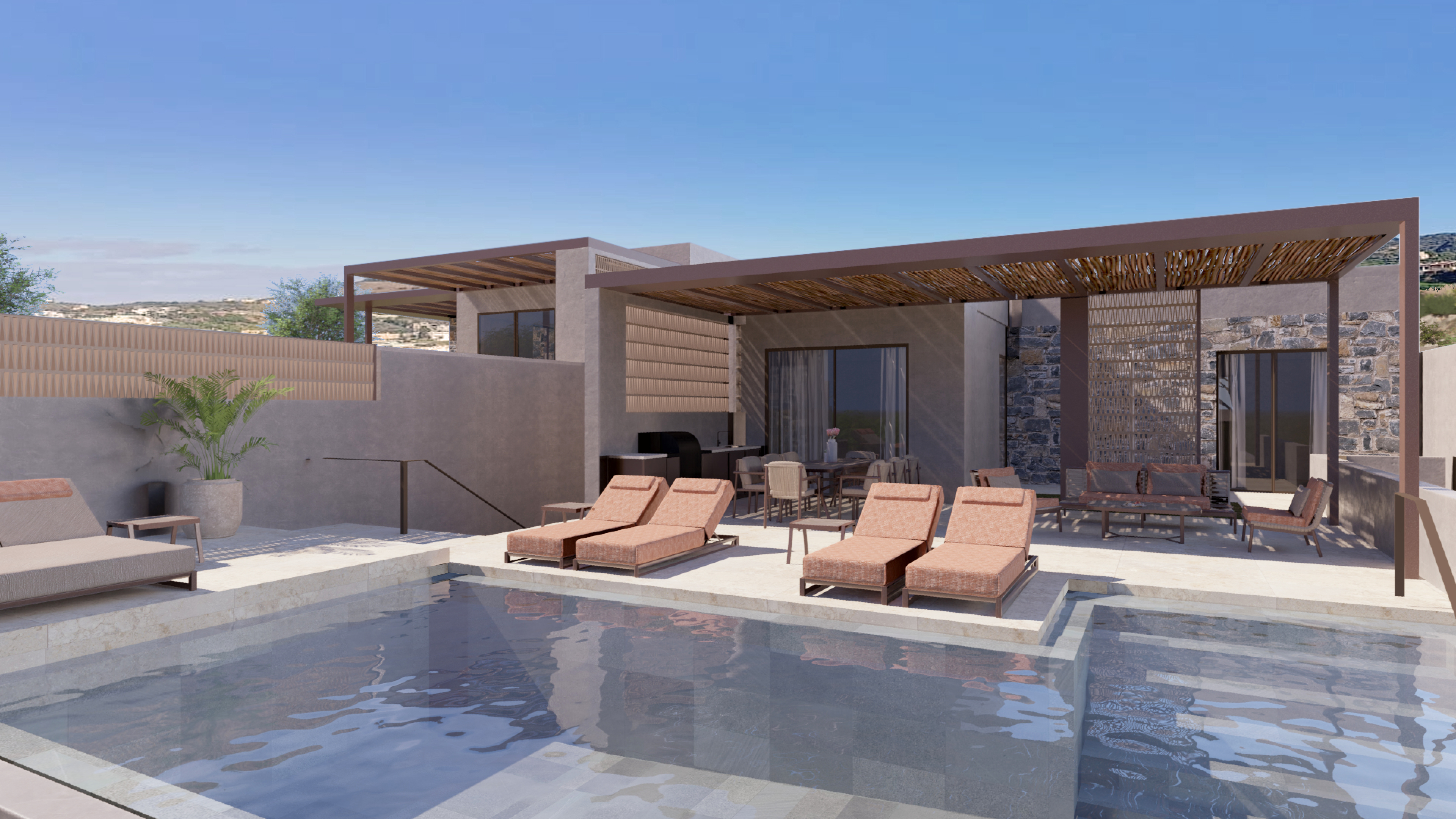 a hyper realistic image of a villa with swimming pool golden hour