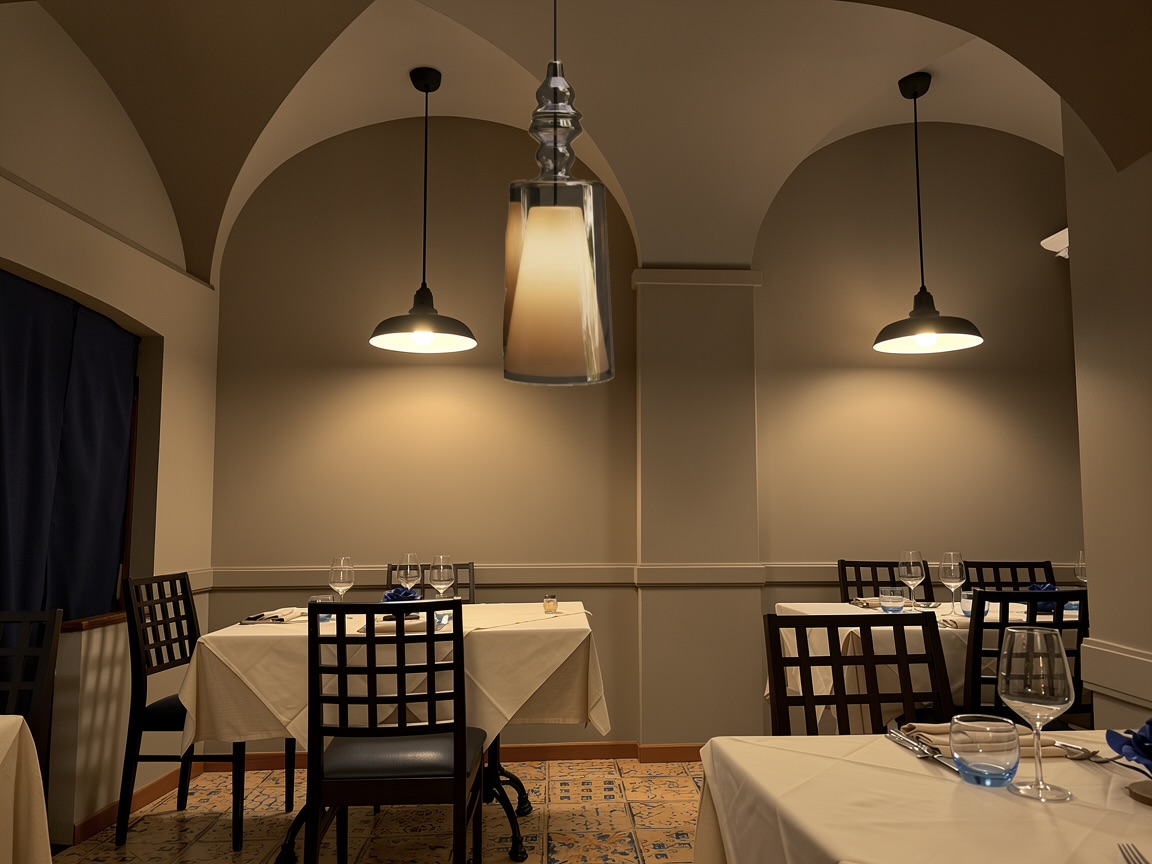 the second lamp is the reference lamp remove the reference image after using it replace the two pendant lamps above the tables first and terza with this exact lamp keep the same position height and scale keep the lamps turned on do not change anything else in the scene