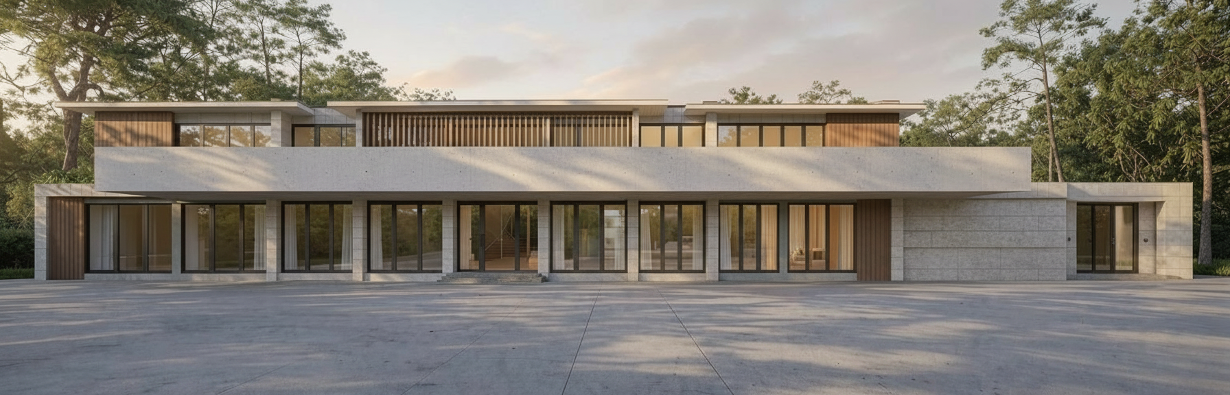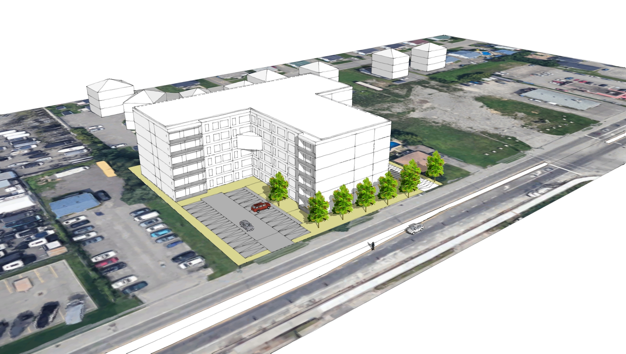 render this residential building keep same geiometry populate with trees and cars architectural visualization