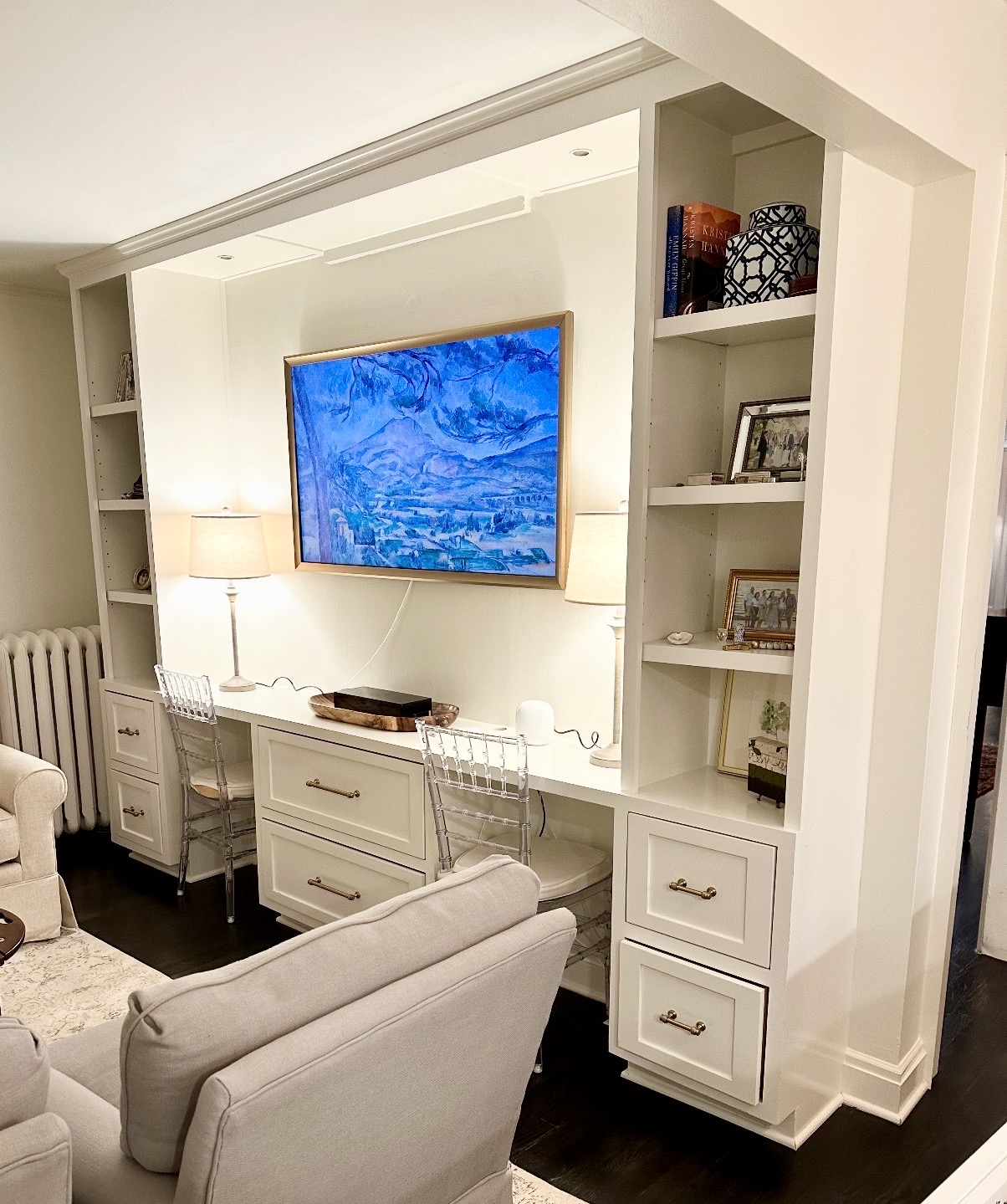 change the paint color of bookshelves walls and ceiling to the dark teal using the color in the reference image