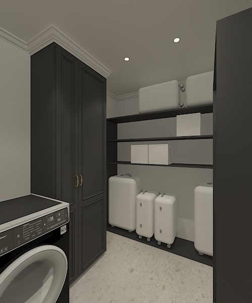 help to make it realistic using the floor stone white marble glossy finishand doff black cabinet gold handle