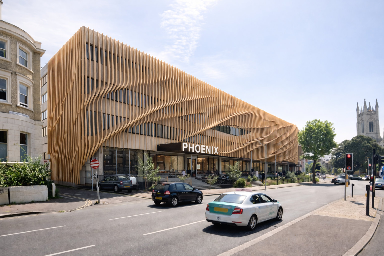 without changing the composition of the image and the building please make this photorealistic and add some further plywood fins down the side of the building as it disappears past the neighbouring brick building and slab extend the fins down to ground level to the left of the phoenix sign