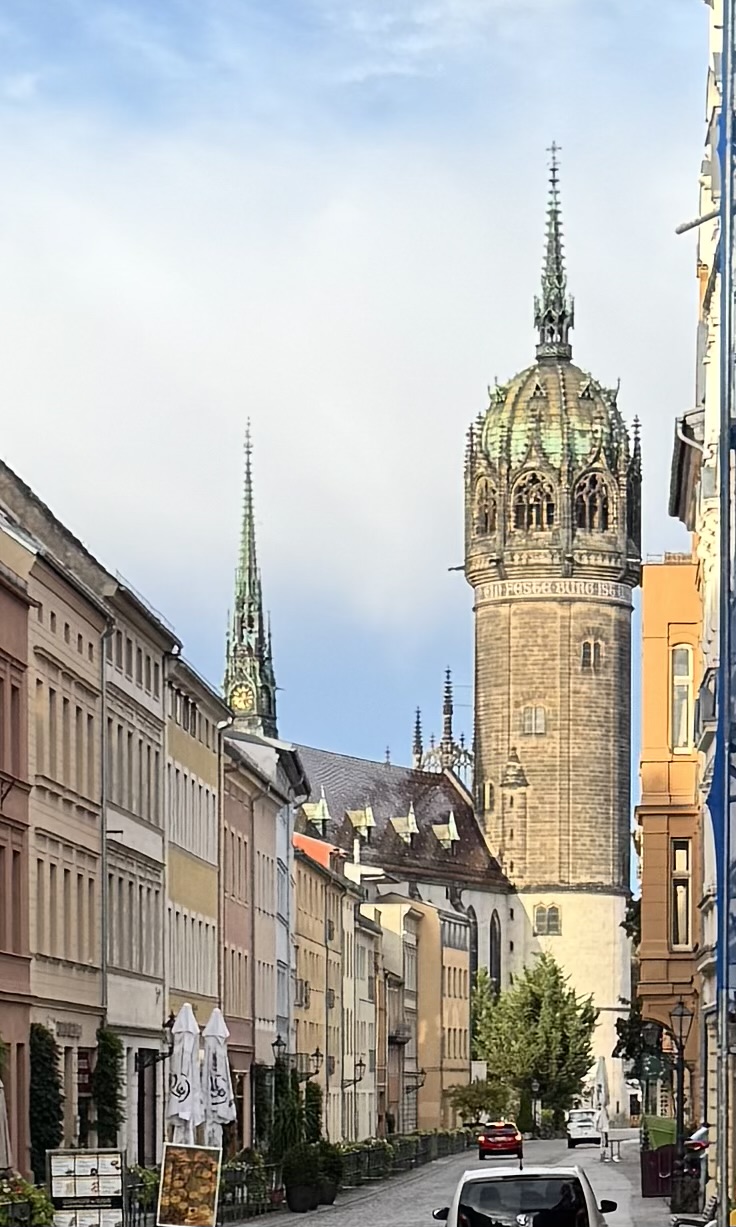 exterior shot realistische stadtansicht einer historischen altstadt der lutherstadt wittenberg aus leicht erh htem blickwinkel vordergrund belebte stra e mit menschen die spazieren gehen an marktst nden einkaufen und in caf s sitzen stra enszene authentisch und lebendig keine bertriebenen menschenmassen geb ude niedrige bis mittelhohe eckh user traditionelle dachformen historische materialien wie sandstein putzfassaden holzfensterrahmen zur ckhaltende moderne akzente dezent kirche im hintergrund schlosskirche wittenberg exakt dargestellt gotische architektur mit markanten t rmen zwei quadratische westt rme hellgelbe sandsteinfassade gro e spitzbogenfenster historisch korrekte proportionen das zentrale portal mit steinernen ornamenten und lutherrose schiefergedecktes dach authentische details wie fialen und ziergiebel neue eckgeb ude f gen sich harmonisch in das fl chendenkmal ein tageszeit heller nachmittag weiches sonnenlicht stimmiger schattenwurf fokus auf historische genauigkeit st dtische integration und nat rliche perspektive