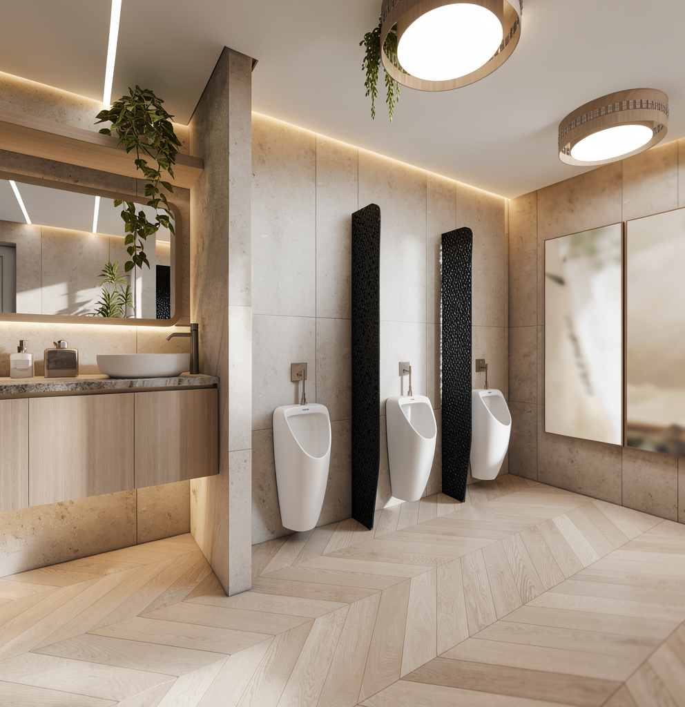 bagno con resina verde salvia e piastrella in graniglia nera sanitari e lavabo in ceramica bianca opaca e rubinetteria cromata mobile sotto lavabo e tenda veneziana in legno rovere naturale lo specchio sopra al lavabo ha la parte destra inclinata e ha una strip led sul lato destro fai entrare un p di luce naturale dalla finestra dietro alla veneziana metti qualche dispenser bagno