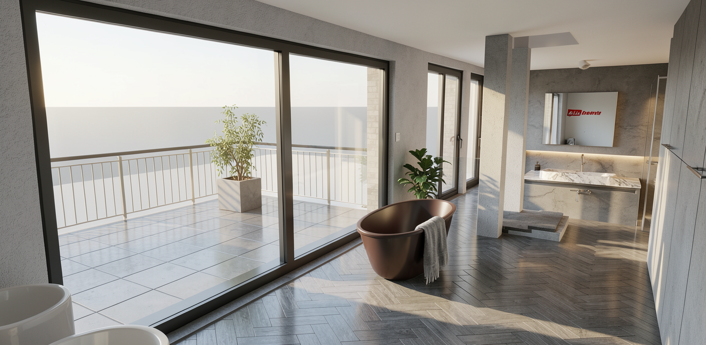 genau dieses rendering berarbeiten fotorealistisches innenraum foto exakt dieselbe perspektive und kameraposition wie das hochgeladene referenzbild 100 identische raumgeometrie exakt gleiche m belanordnung exakt gleiche verlegeart und richtung von parket wie vorlage exakt identische fensterpositionen mit gleichem ausblick auf den z richsee 40 meter tiefer durch die fenster weiches nat rliches tageslicht leicht schr g einfallende sonne durch die grossen fenster geschlossene r ume k nstlich ausleuchten sanfte realistische schatten blickrichtung ist nach s den sonnenlicht kommt von westen realistische materialien echte holztexturen stoff mit leichten gebrauchsspuren hochwertige oberfl chenreflexionen kleine gr npflanzen tisch oval mit marmor collemandina grigio in braungrau dunkel k che edelstahl schrankfronten auf rechter seite alle grauglas gl nzend grifflos parket vergraut alle sichtbaren w nde sind sichtbeton sehr modernen minimalistischer look nat rliche farbwiedergabe golden hour feeling das bild muss wie eine professionelle fotografie aussehen es soll ein echtes und reales foto sein canon eos r5 35 mm festbrennweite f 2 8 hyperrealistisch dslr qualit t raw aufnahme 8k aufl sung extrem scharf perfekte tiefensch rfe professionelle architekturfotografie