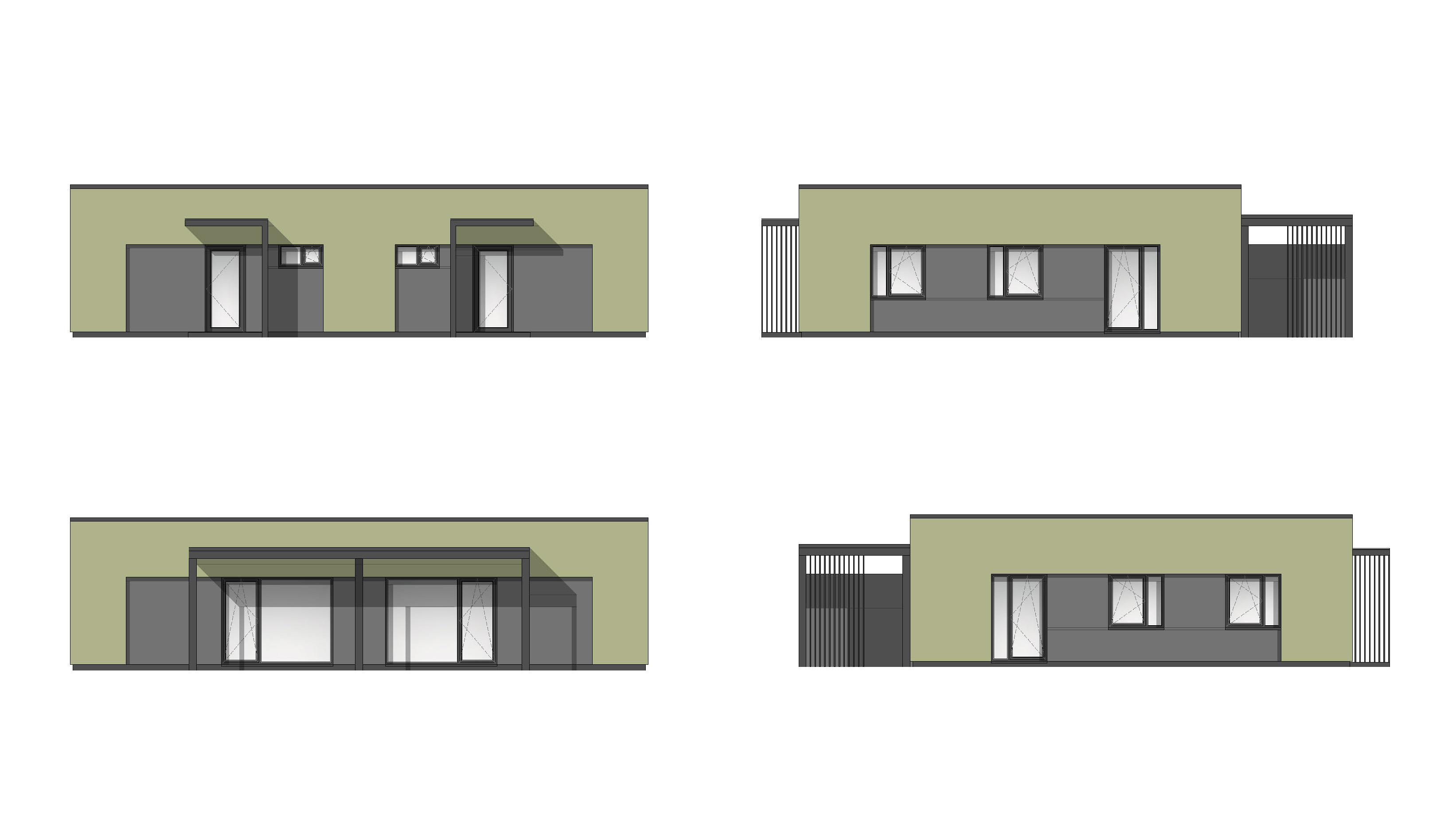 modern minimalist architecture facades single story rectangular house olive green facade with dark gray 45 degrees wood planks large glass windows sleek metal slats set in a serene suburban environment soft natural lighting some greenery in the surroundings a couple scots pines calm and tranquil atmosphere cloudy blue sky backdrop with light clouds warm and inviting tones