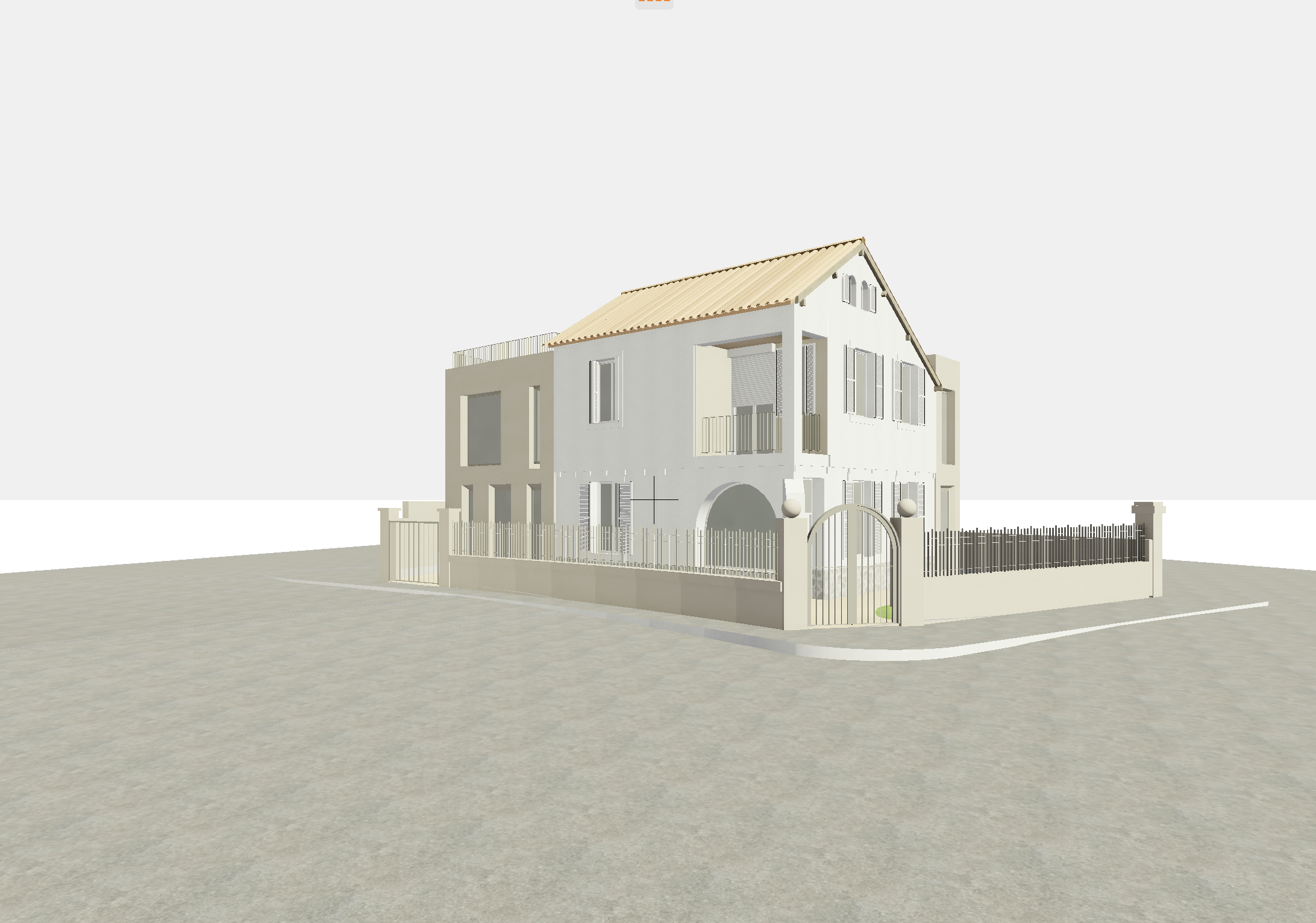 lot of reflects and sun light the sun illuminates the facade that we see some trees and a street of marseille in the backgroung facade more in the light more reflect all is painted no stone the fence call is beige like the extension