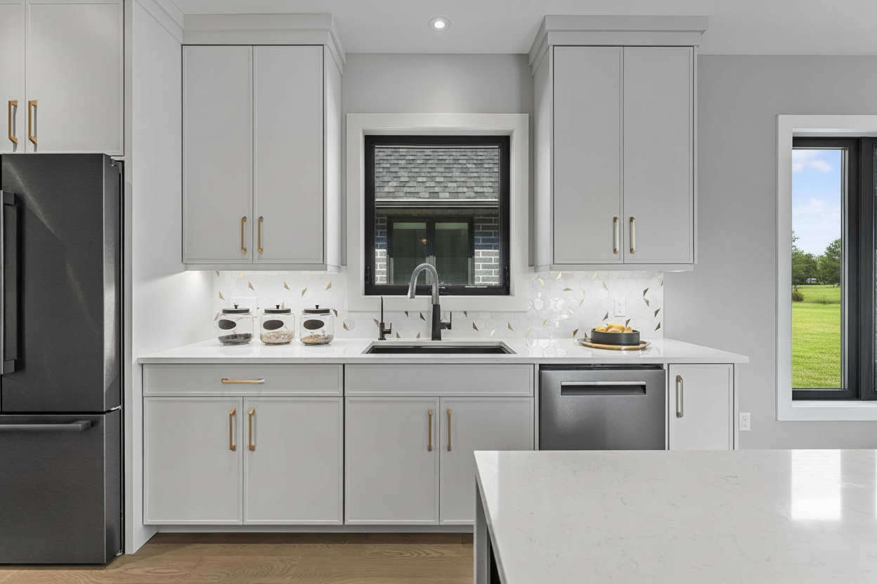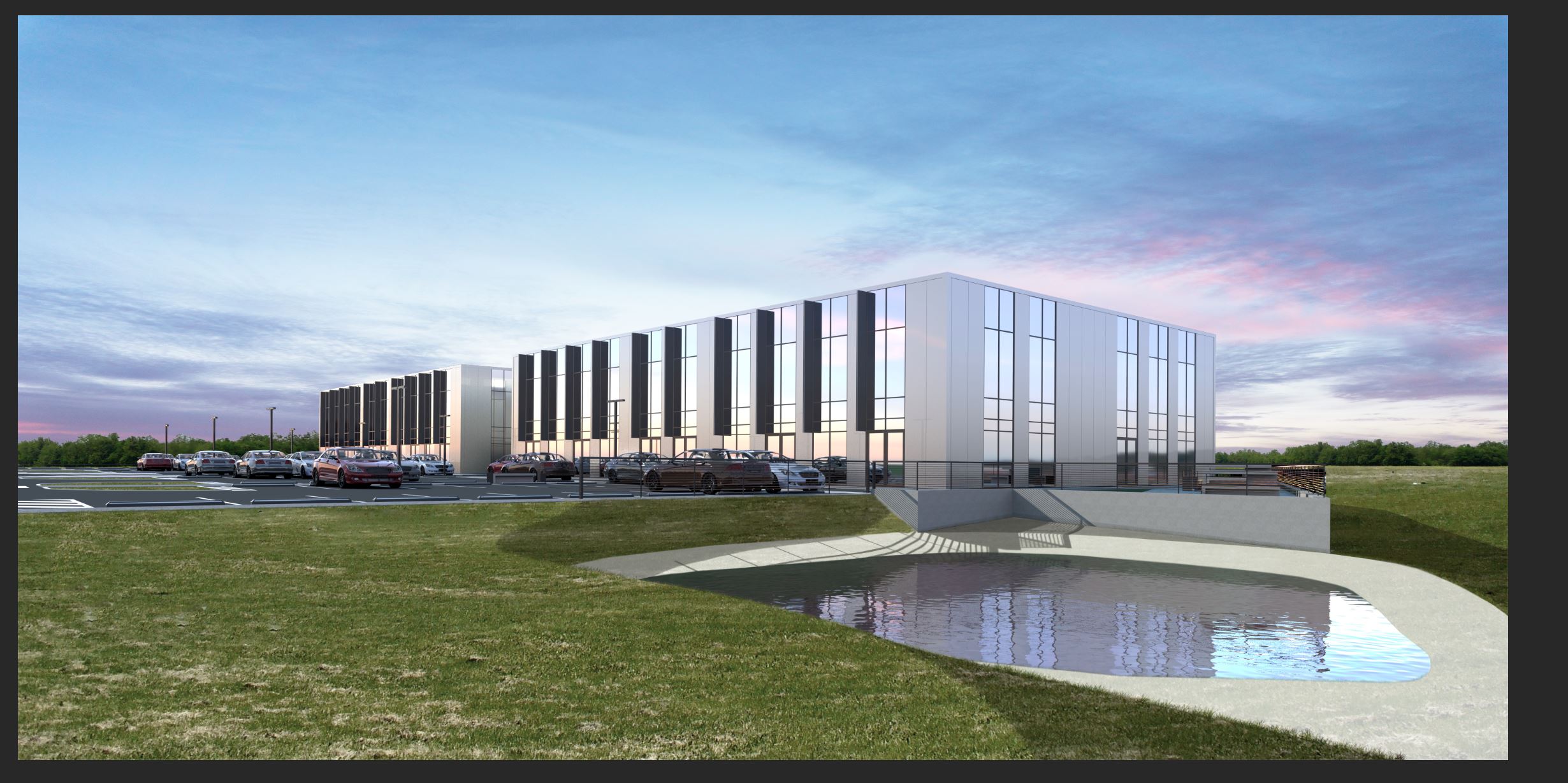 a modern office building with sleek reflective glass panels set against a vibrant sunset sky the sky is a blend of soft pinks and blues adding warmth to the scene the parking lot in front features a mix of cars in various shades of silver black and maroon lush green grass surrounds a tranquil reflective pond in the foreground the atmosphere is calm and serene with a touch of elegance and modernity