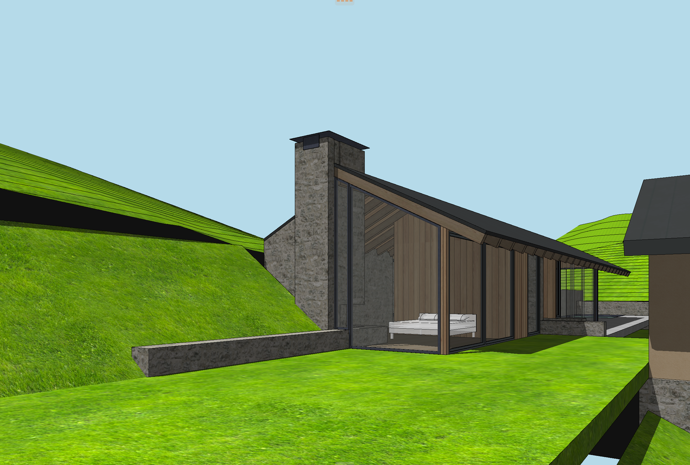 andscape hillside with sagebrush and tall wild grasses brown drystack stone walls corten standing seam metal roof