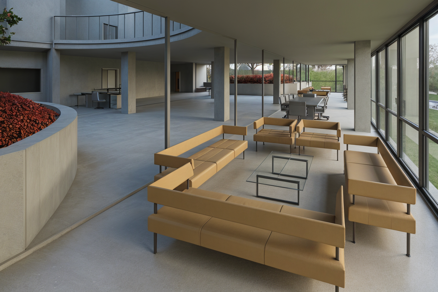 modernist interior shot a modern living room featuring sleek contemporary design with a minimalist aesthetic cozy atmosphere with warm earth tones the walls are a soft cream complementing a dark wood floor the large sectional sofa is upholstered in a subtle taupe fabric adorned with plush light gray cushions for contrast a round coffee table made of polished dark walnut stands at the center holding a simple elegant decor piece the shelves display minimalistic black and white art and small decorative plants adding a touch of nature soft lighting emanates from a stylish geometric chandelier casting a gentle glow enhancing the room s serene ambiance architecture