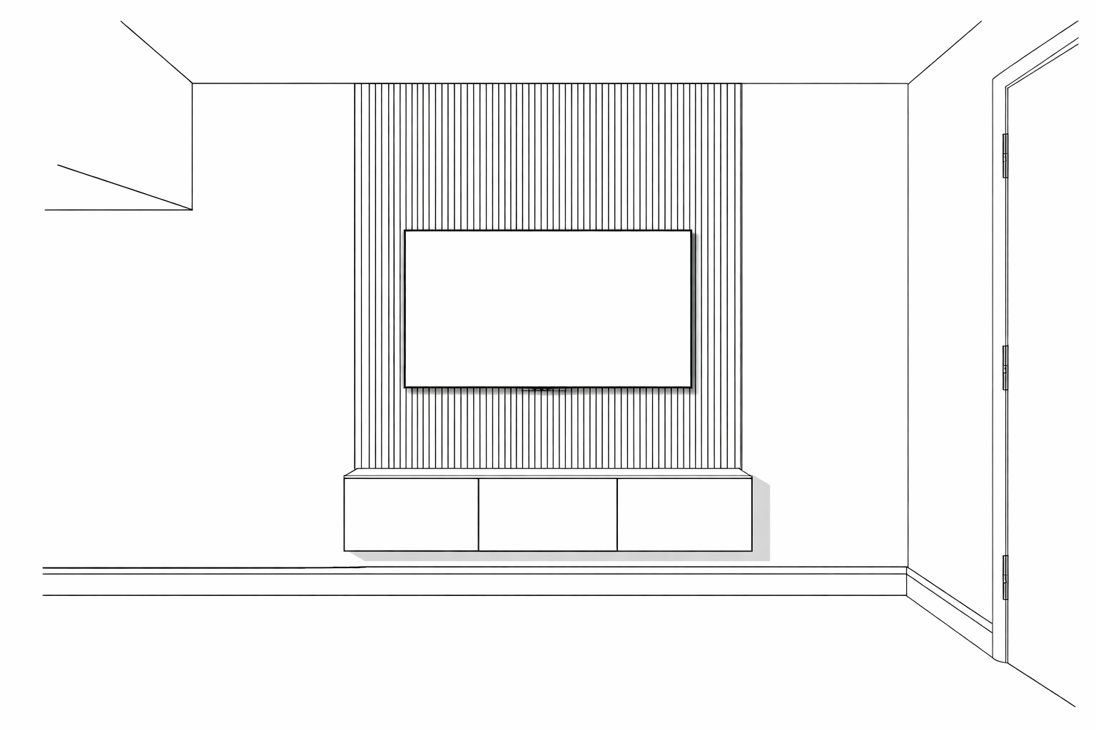 create real image tv unit is white slatted panels oiled oak color make it lokk profesional