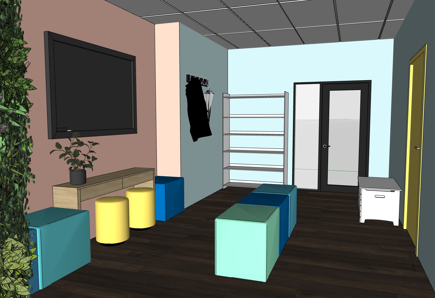 office reception with artificial light dark wood floor suspended ceiling with white tiles and led pannel light the wall on the right is baby blue with a yellow door show an office building corridor throw the glass door with black frame the wall on the left is a soft coral color