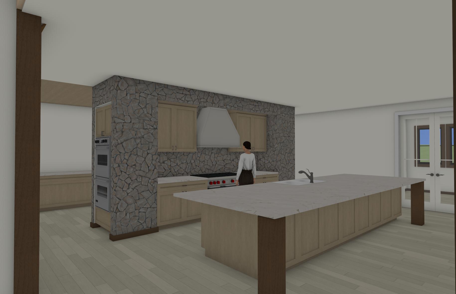 make interior look like a jackson hole interior rustic but modern add chairs at island make walls and ceiling plaster it s important to keep the sizes of everything the same change textures and materials but keep the sizes of everything the same make rock realistic its important to keep to scale this room is big the person in background is 5 6 for scale do not change size of windows or doors do not add doors or windows dont add furniture but add 5 chairs at island do not change or add fixtures