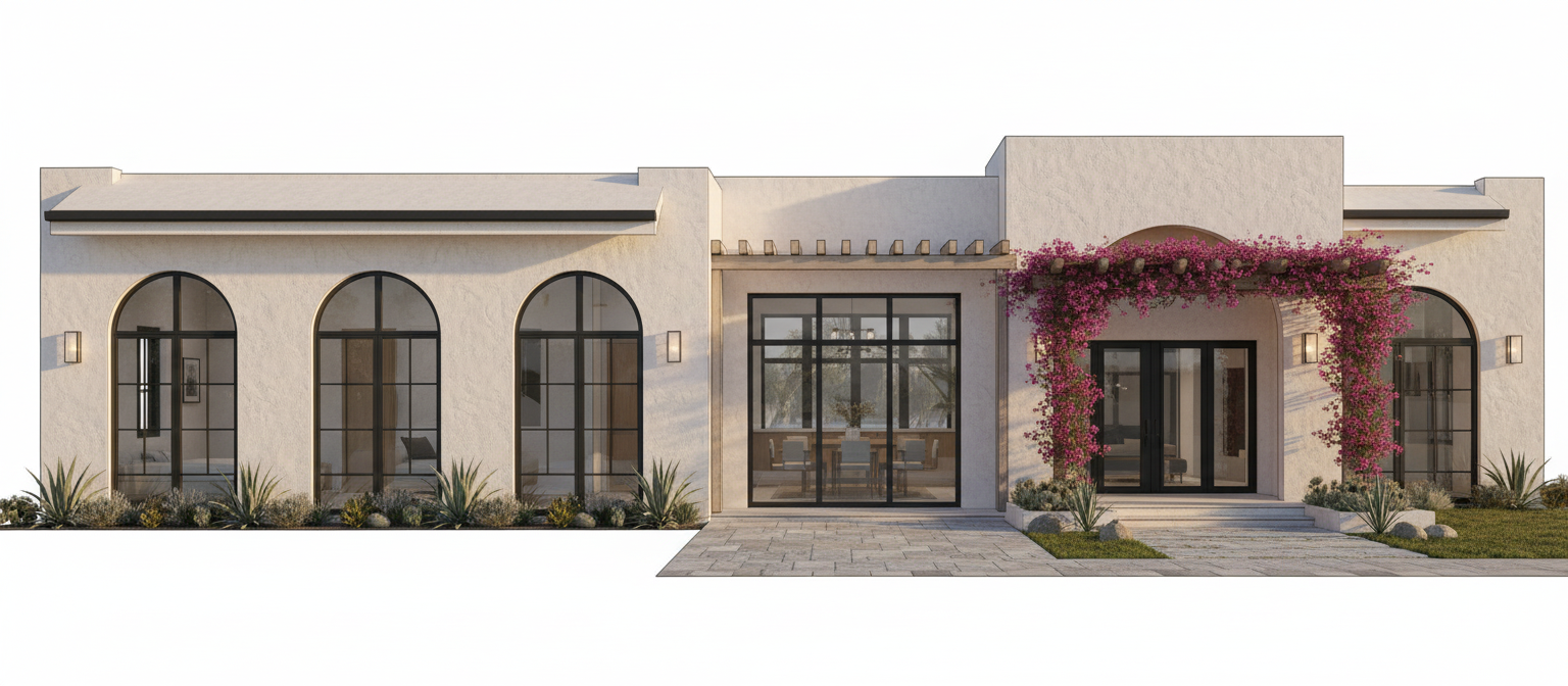 create a realistic 3d scene make the brick a light brown mixed brick make the stone a light brown stacked stone make the stucco a light white