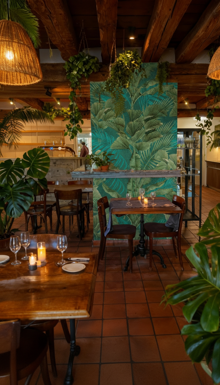 a glowing pink neon sign on the wall reads brazil grill in palm canyon drive font warm woven rattan pendant lamps hang from the ceiling softly glowing with dimmed atmospheric light additional neon tube lights in pink purple orange and yellow are placed around the space some attached to the wooden beams some mounted on the green wall and some leaning casually against corners or near plants the ambience is intimate tropical and vibrant with low warm lighting contrasted by the strong colorful glow of neon lights the geometry layout perspective and furniture arrangement must remain exactly the same as in the original image