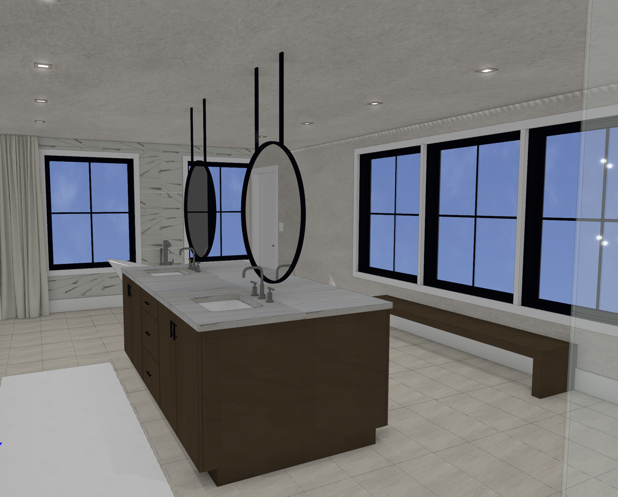 render a modern luxurious kitchen with a central island featuring a smooth white marble surface the island should have a natural oak finish to the cabinetry with dark metal handles two tall oval mirrors are elegantly mounted above framed in matte black the lighting is warm and inviting emitted from a sleek gold rectangular chandelier with soft white bulbs large windows reveal a clear blue sky allowing natural light to flood the space the walls are painted in a soft beige to enhance the warmth and the ceiling has recessed lighting for a sophisticated and contemporary atmosphere the overall ambiance is serene airy and refined