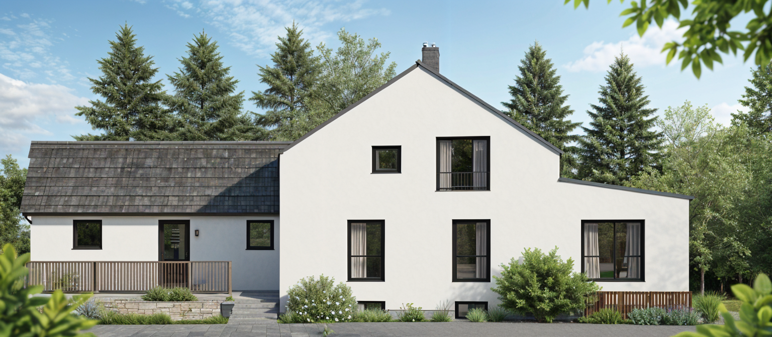 photorealistic re render of the exact same building with identical architecture identical window placement identical facade composition identical roof line only enhance materials lighting and textures to photorealism do not change architecture do not add penthouse levels do not change building proportions photorealistic architectural photography of a modern 4 story residential building with setback penthouse level dachgeschoss located at st peter hauptstra e 66 graz austria established austrian suburban residential context mix of single family houses and smaller apartment buildings across the street mature street trees calm two lane urban road typical of graz s st peter district architecture white rendered facade mineralischer putz with subtle micro texture irregular rhythm of tall narrow vertical windows with dark anthracite aluminum frames slim french balcony metal railings in anthracite grey dark grey plinth level flat roof with deep overhang setback top floor penthouse partially visible clean contemporary styrian residential architecture understated and timeless lighting late afternoon golden hour warm low sun from the left southwest casting soft long shadows hazy warm sky with wispy cirrus clouds not saturated blue foreground context realistic asphalt of a calm residential street faded road markings bike lane mature deciduous trees not uniform cg vegetation softening the facade manicured but natural hedges and ground planting low existing villa building peeking in on the right preserved heritage structure next to the new development staffage 2 3 people mid motion a couple with a small child walking the sidewalk one cyclist passing one parked family car natural proportions motion blur suggesting life no crowds technical shot on sony a7r iv 35mm lens f 8 architectural perspective correction no converging verticals natural depth of field architectural magazine quality h user architektur aktuell aesthetic grounded atmospheric austrian context not mediterranean not scandinavian avoid cgi look plastic materials oversaturated blue sky cartoon vegetation empty sterile street over sharpened edges 3d render aesthetic mediterranean palm trees american suburb modernist glass box