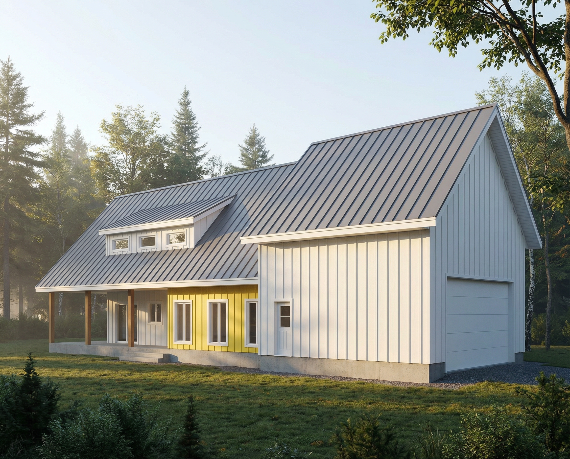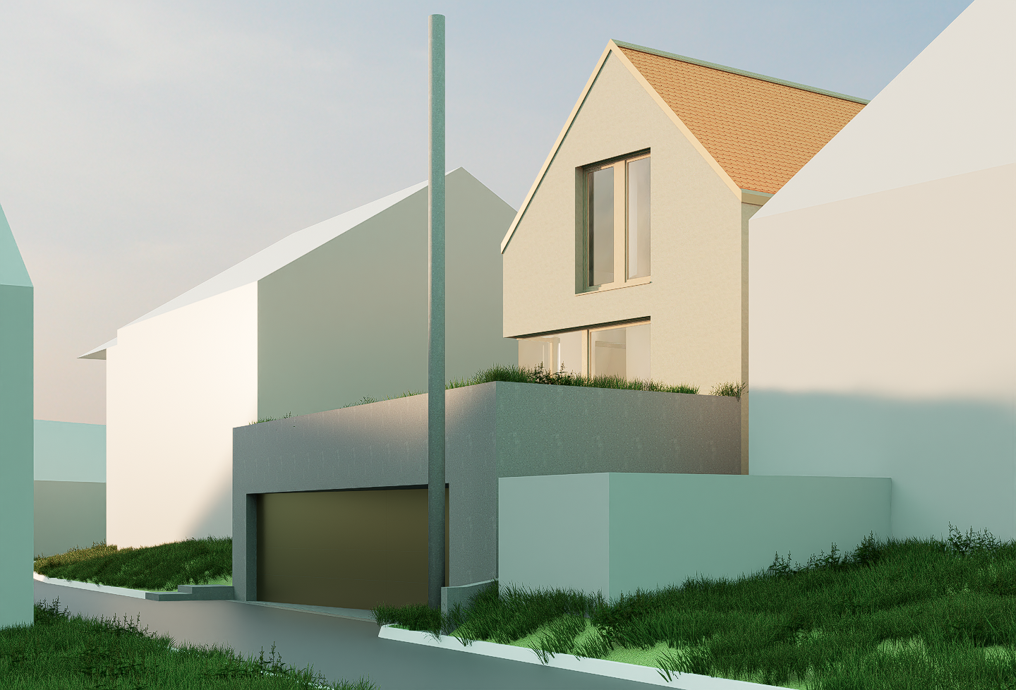 create a photorealistic architectural visualization of the provided scene from an elevated aerial viewpoint preserve all original materials colors lighting fog and the overall atmosphere of the scene exactly as they are enhance the composition by adding realistic trees in the foreground and shrubs low vegetation exclusively on flat roofs do not place any vegetation on pitched or tiled roofs maintain high material accuracy realistic light behavior in fog soft shadows and a professional architectural visualization style do not change the mood weather conditions or environmental atmosphere of the scene