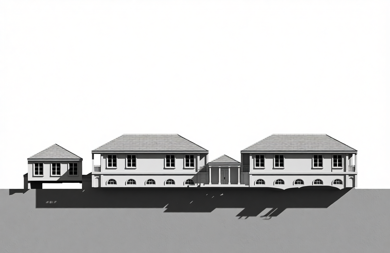 turn these elevation into an architectural hand pencil sketch in black and off white beige keep the same exact view no perspective add drop shadows