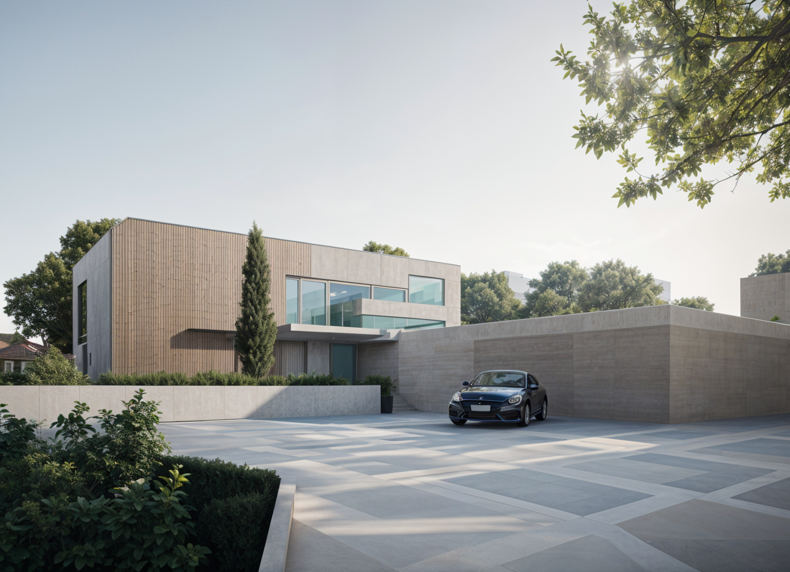 the template shows the south fa ade of a single family house in birgitz create the view photorealistically with a white plastered fa ade window areas with black window profiles and black metal profiles as railings the background is a cloudy sky with mountains the attic has a recess to the upper floor the large window in the middle with glass blocks architecture