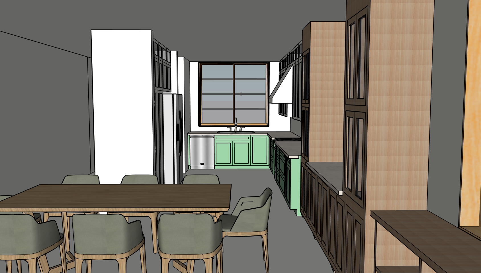 no window at the left add window on the right between the upper dining room cabinets above counter height have sunlight come through the windows on the right