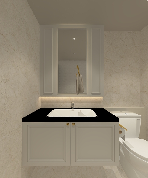 wall tiles in beige glossy color as well as for the tiles no pattern for the wall tiles and the floor tiles off white atau light grey doff cabinet with gold handles and accessories make a bright and white ambiance for this modern classic toilet