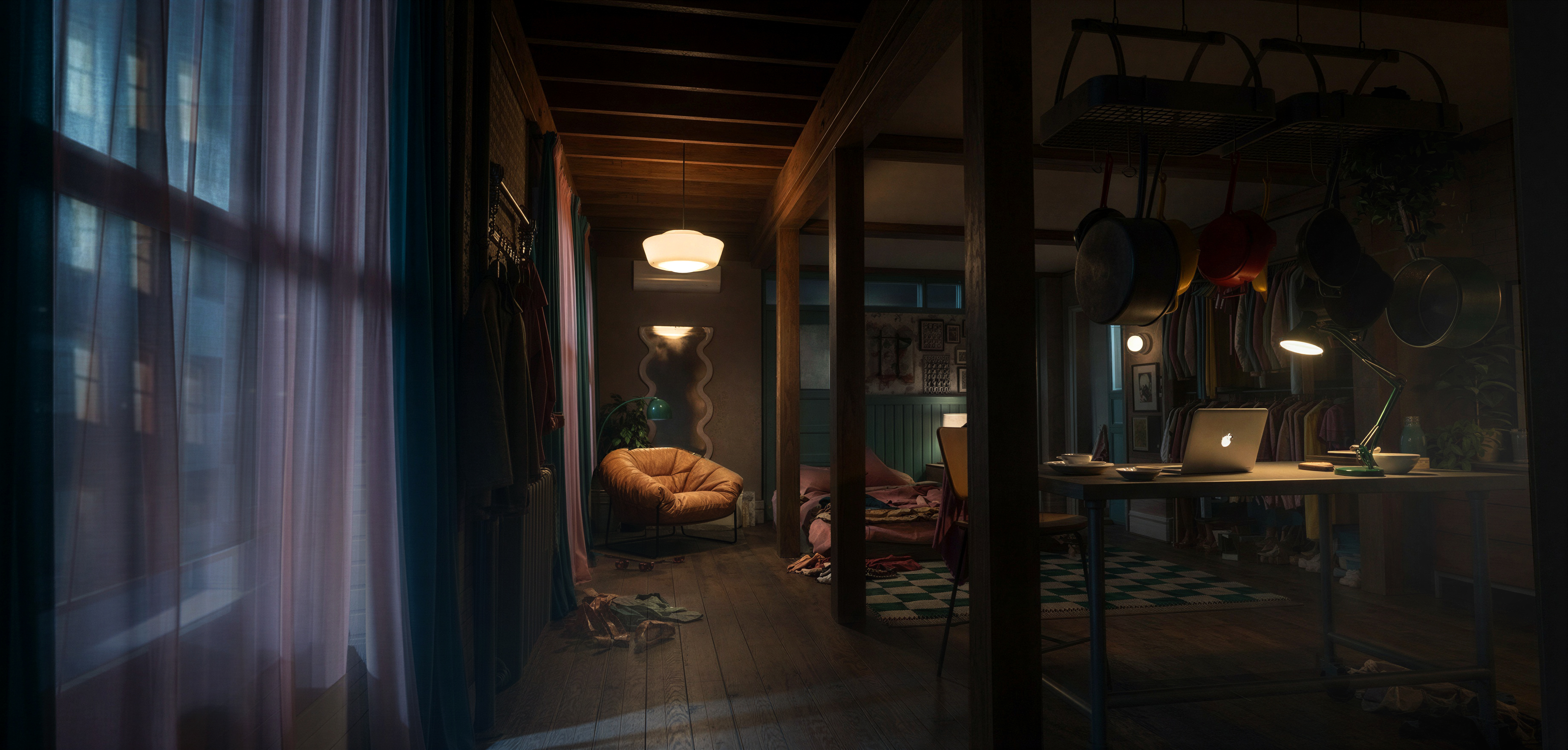 add renee rapp to the existing leather chair she has long blond hair she is wearing an oversized black blazer and oversized baggy blue jeans she is slouched with her head in her hands she is upset she is silhouetted she matches the lighting conditions of the room