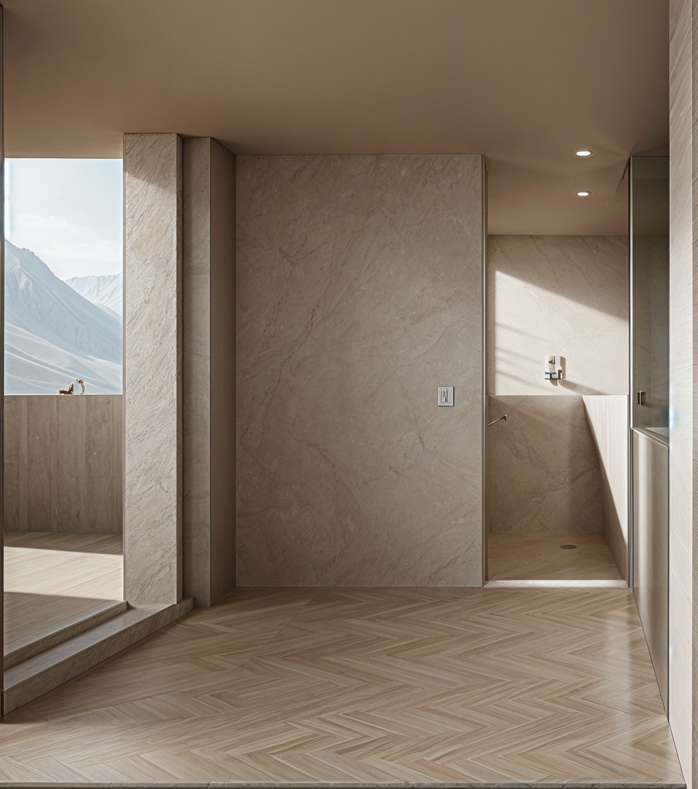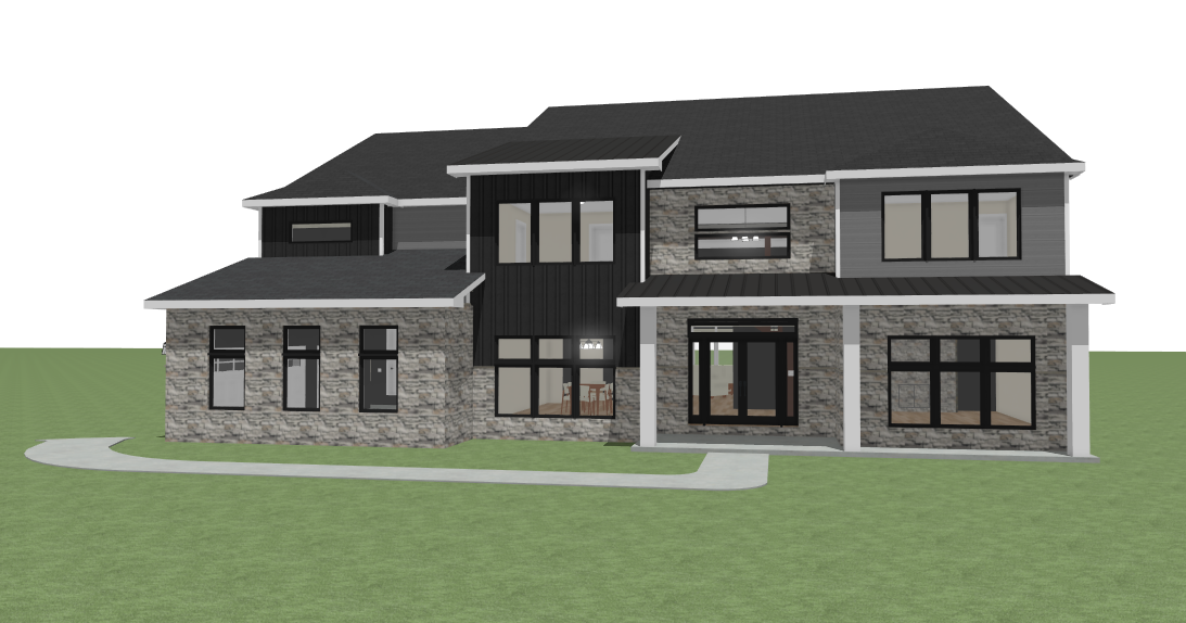render this 3d image to appear photo realistic maintain all existing architectural materials and structural elements exactly as shown enhance the setting with a lush well maintained landscape include minimal garden beds manicured shrubs and a tree lined backdrop that frames the home naturally the windows should have a glossy finish with clear reflections of the surrounding trees and sky lighting should feel natural with soft shadows and realistic depth to bring the scene to life