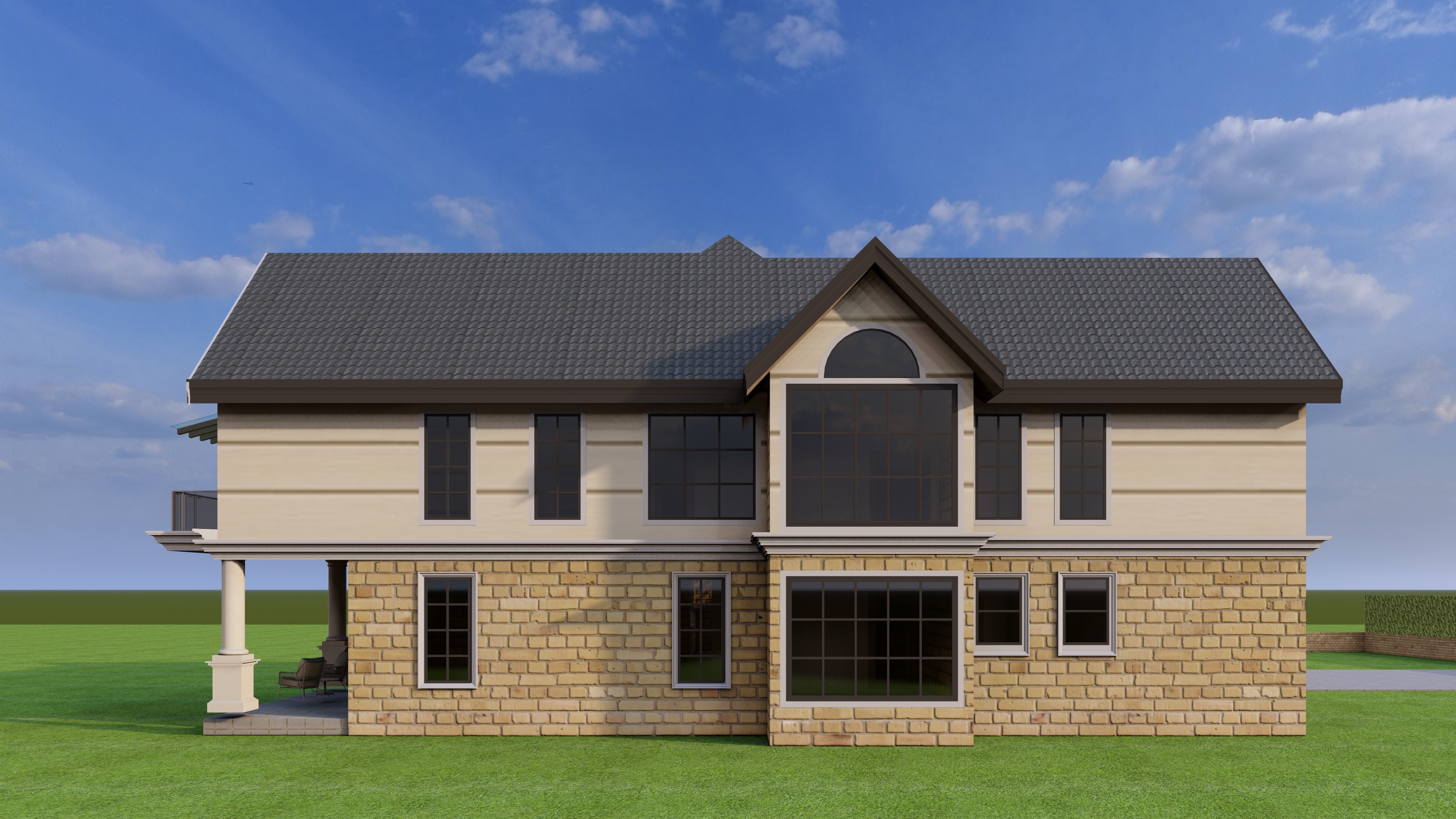 a model of a house add few rees in background for context add very few bt neat vegetation with floral ones for context too the upper walls should be beidge light brownish retaining the three horizontal key lines give picture sunsety vibe 3 4 p m