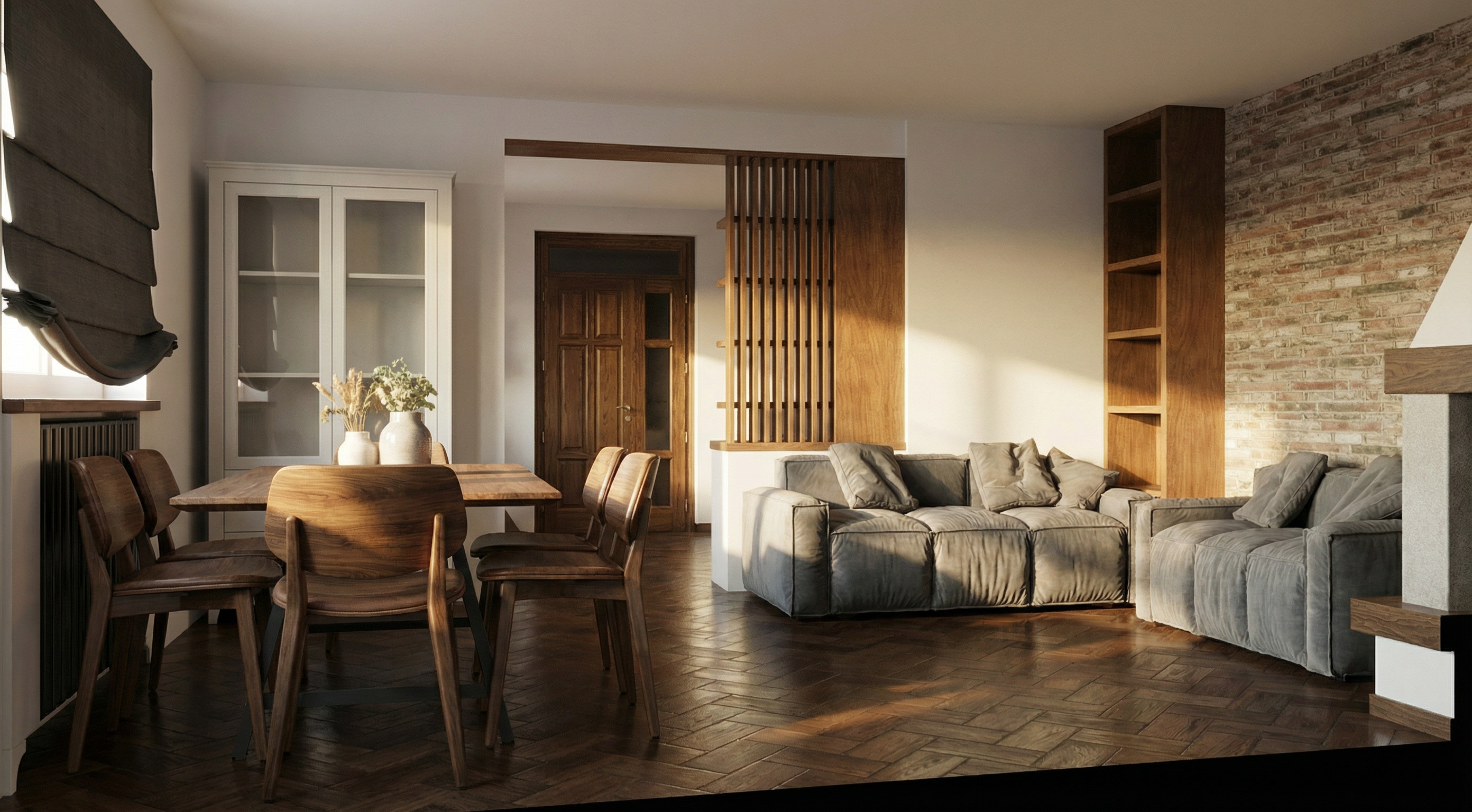 create an artist imperssion with planting to the small grassed area in front of the window light grey windows and doors light rustic red roof pan tiles light cloudy sky summer golden hour maintain shapes dont change lines