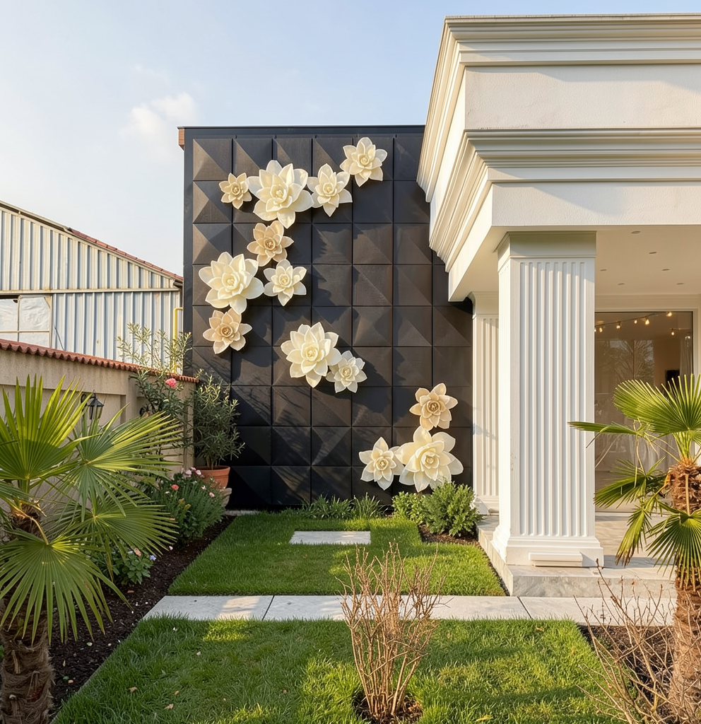 zaha hadid exterior shot photorealistic architectural presentation rendering of a renovated traditional house and annex located in an authentic romanian rural village in the banat region the scene must feel alive warm and emotionally engaging not sterile camera positioned from inside the backyard garden looking toward the street and front boundary showing the transition from private modern garden to the rural village beyond the garden is modern minimalist but vibrant and natural fresh green lawn ornamental grasses moving gently in the wind small contemporary shrubs subtle gravel accents and soft shadow patterns add natural imperfections for realism at the front boundary include a modern minimalist fence with horizontal anthracite metal slats partially transparent allowing visual connection to the street and village beyond beyond the fence clearly show the authentic romanian rural street scene narrow asphalt or lightly worn rural road neighboring single story romanian village houses with traditional red ceramic tile roofs varied plaster colors white beige pale yellow light pastel tones visible utility poles and overhead cables wooden gates and fences distant trees orchards and open green fields realistic spacing between houses the main house and annex preserve their exact existing volumes roof geometry and openings no architectural changes only finish modernization walls finished in elegant light warm white plaster highly realistic texture roof covered with authentic red ceramic roof tiles detailed and realistic lighting is cinematic warm late afternoon golden hour sunlight strong directional sunlight creates long soft shadows depth and contrast sunlight illuminates the facade beautifully creating highlights and realistic reflections add subtle life elements to enhance realism slightly open gate light wind moving grass warm interior light glow visible subtly through windows a parked modest car partially visible on the street optional realistic european car natural environmental storytelling sky is dramatic but realistic blue sky with soft warm clouds golden sunlight atmosphere rendering must feel like professional architectural photography emotionally engaging and suitable for client presentation rendering quality requirements ultra photorealistic cinematic lighting global illumination ray tracing physically based rendering pbr materials high dynamic range strong depth and contrast architectural photography composition 4k resolution camera settings eye level perspective 35mm architectural lens slight depth of field professional framing mood and atmosphere warm welcoming lived in authentic romanian rural identity modern but respectful intervention premium architectural presentation quality architecture