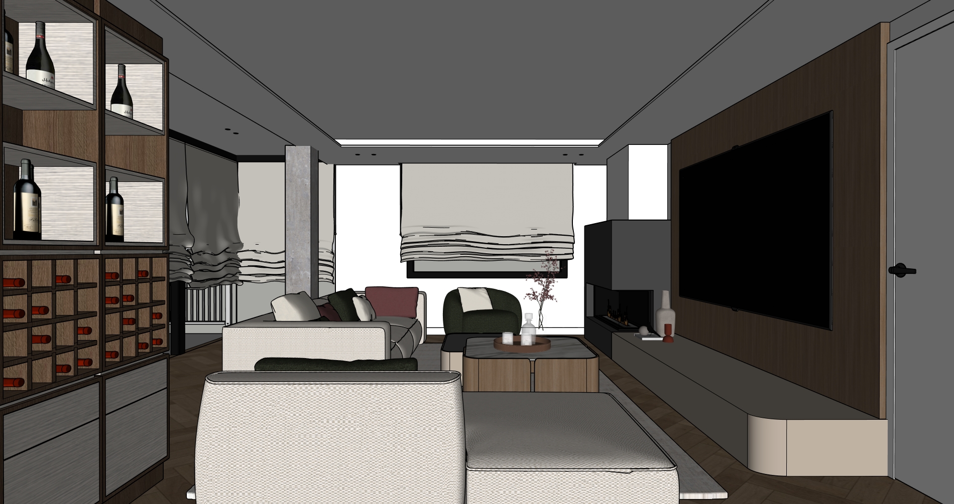 crea una imagen fotorealista a partir de este sketchup realza las texturas e iluminacion