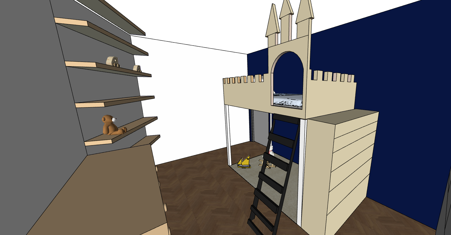 bed is light beige color ladder is dark wood color