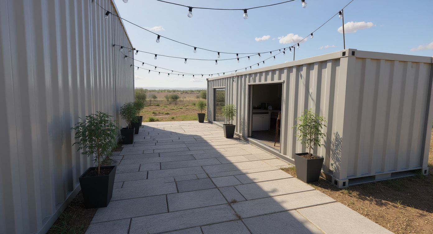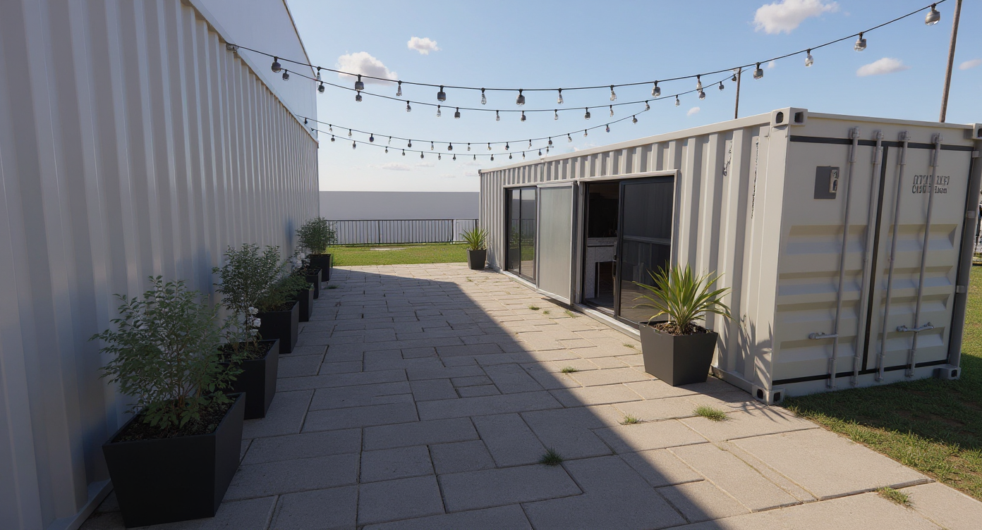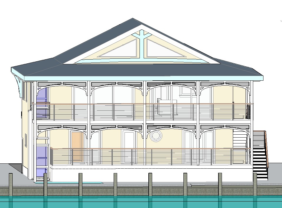 the home is a very pale yellow and the trim is white the the home sits about 20 back from the dock in the foreground the home is in the florida keys and there are palm trees nearby