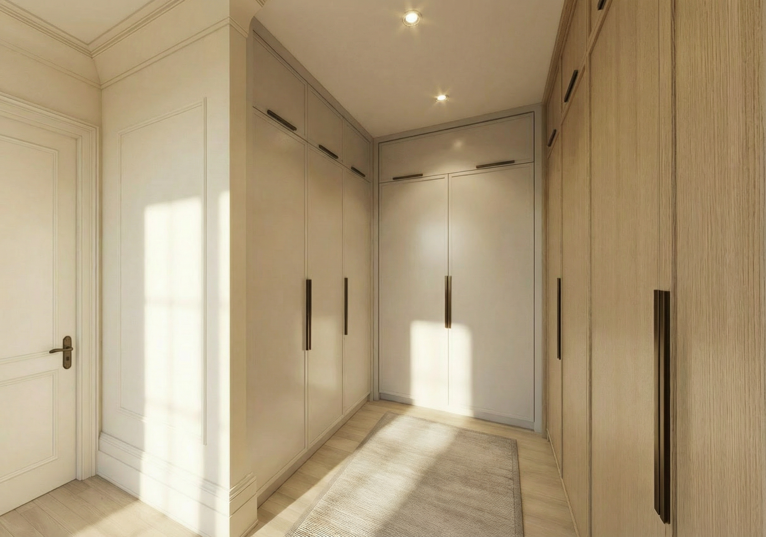 do not change the cabinets in any way preserve the exact cabinet colors materials finishes dimensions door and drawer styles hardware spacing alignment and all geometry exactly as shown do not alter the countertop shape backsplash appliances flooring lighting fixtures or wall structure only remove the construction materials clutter and mess from the scene clean the room and make it look finished and staged add a few simple tasteful home accessories appropriate for the style of the space but do not add or remove any furniture windows or architectural elements maintain the original lighting direction and realism enhance clarity and polish the photo while keeping the cabinetry and room design completely unchanged do not alter the lighting to keep the cabinet colors as they are in the image add flooring add gold cabinet pulls to the door and drawer fronts stage the countertop for a working kitchen island remove the ladders and blur out the background do not change the cabinet lighting or orientation of the image at all