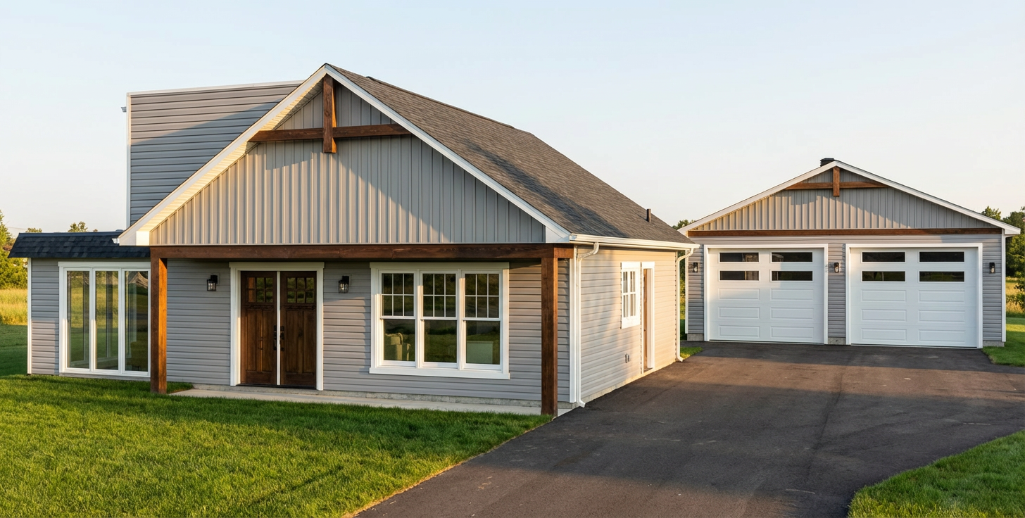 residential gray pearl vinyl siding residential gray pearl board and batten vinyl white doors and windows wooden beam gray asphalt shingle roofing