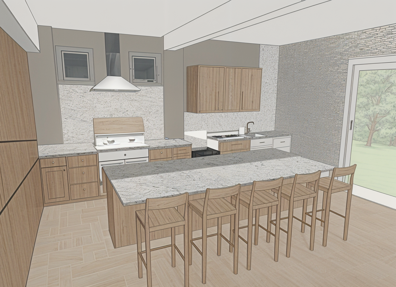 modernist interior shot render a modern dining and kitchen area with a sophisticated and luxurious atmosphere use a soft warm ivory for the dining chairs and barstools to create a cozy appeal the dining table should be an elegant deep espresso brown giving it a rich look decorate the overhead chandelier with golden accents for a touch of luxury and a gentle warm glow the walls should be finished with a combination of matte white and textured gray panels for a contemporary feel incorporate a wooden partition with horizontal slats in dark walnut to balance the open space the kitchen counter should feature a sleek marble surface in a blend of whites and soft grays complemented by stainless steel fixtures for a modern touch use recessed ceiling lights and pendant lights in black and gold to provide soft ambient lighting add subtle green plants and metallic decor items on the shelves for a hint of color and style the overall atmosphere should be a mix of modern sophistication and inviting warmth architecture