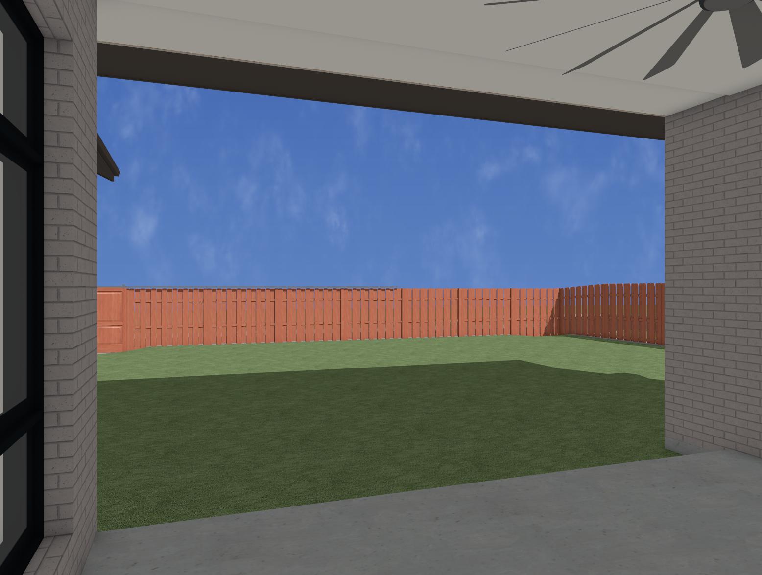 add modern swimming pool with decking in the backyard leave green space for play towards the back corner of the yard