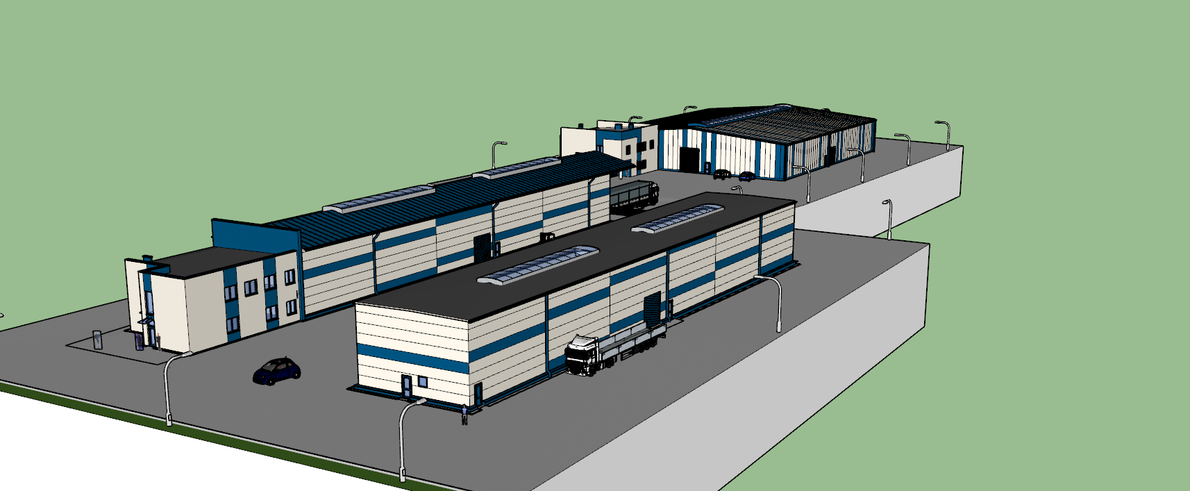 modern industrial buildings the administrative part covered with ivory and blue fiber cement panels and the warehouse part with ivory and blue sandwich panels low vegetation around the building blue joinery blue industrial gates lamps above them sunny sky with few clouds and forest in the background forest and industrial buildings in the background