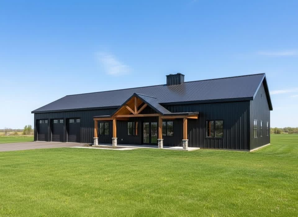 modernist exterior shot a modern farmhouse with a blue metal roof and white exterior walls large windows glowing with warm light in the foreground a lush green lawn stretches out the background sky is a soft gradient of pink and orange hues suggesting a tranquil sunset the atmosphere is serene and inviting with a peaceful rural setting architecture