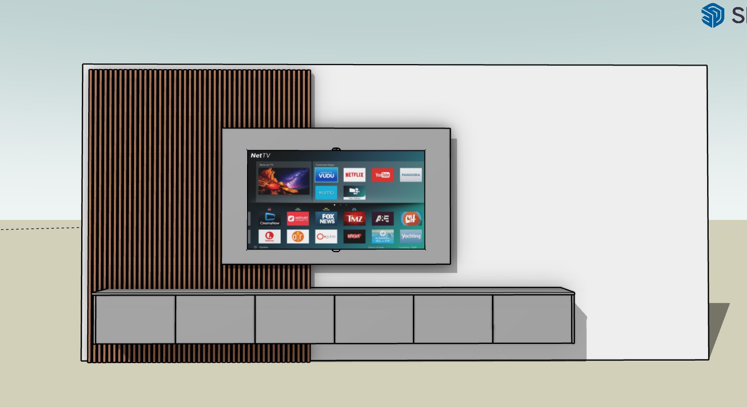 this is a tv unit with a floating cabinet and acoustic panels there are led lights behind the acoustic panel and around the panel behind the tv