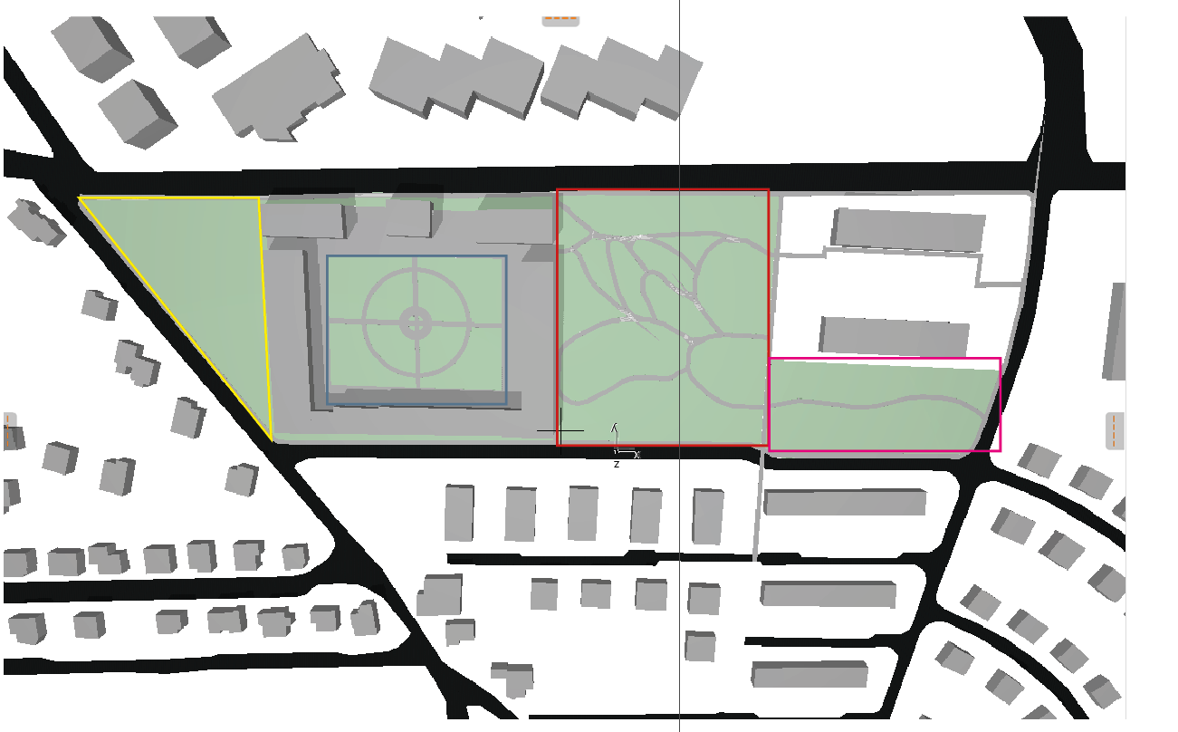 create a high quality top down landscape architectural visualization based on an uploaded masterplan the original plan uses color coded zones replace them with realistic visually appealing aerial representations while preserving the exact layout shapes and boundaries style contemporary landscape architecture soft natural rendering semi realistic clean but atmospheric top view orthographic detailed textures subtle shadows high resolution yellow area kindergarten garden design an organic playful landscape inspired by a former agricultural site avoid artificial playground elements use sculpted terrain natural materials and a sensory tactile path made of crushed brick concrete fragments sand and wooden logs include small cultivation plots mini fields fruit trees shrubs and informal dirt paths atmosphere adventurous educational nature based play blue area courtyard therapeutic garden create a calm geometric courtyard with a rectangular grid divided into four quadrants and a soft oval inserted inside in the center place a water feature surround with a wide paved perimeter subtle not dominant include seating along edges and within the oval planting should be sensory aromatic herbs lavender sage soft textured plants ornamental grasses and calming color palette blue purple yellow accents atmosphere peaceful healing structured red area phytoremediation park design a naturalistic park focused on ecological restoration use flowing organic paths forming a permeable network include varied terrain wetlands for water retention and planted zones representing phytoremediation processes vegetation should look dynamic and layered grasses wildflowers sunflowers prairie species and scattered trees e g poplars the park should feel like a living laboratory ecological evolving slightly wild but intentional pink area playground create a nature playground integrated into the landscape use wood stone and rope structures instead of standard equipment incorporate terrain modeling for climbing and exploration add trees for shade and open grassy areas atmosphere social natural connected to surroundings