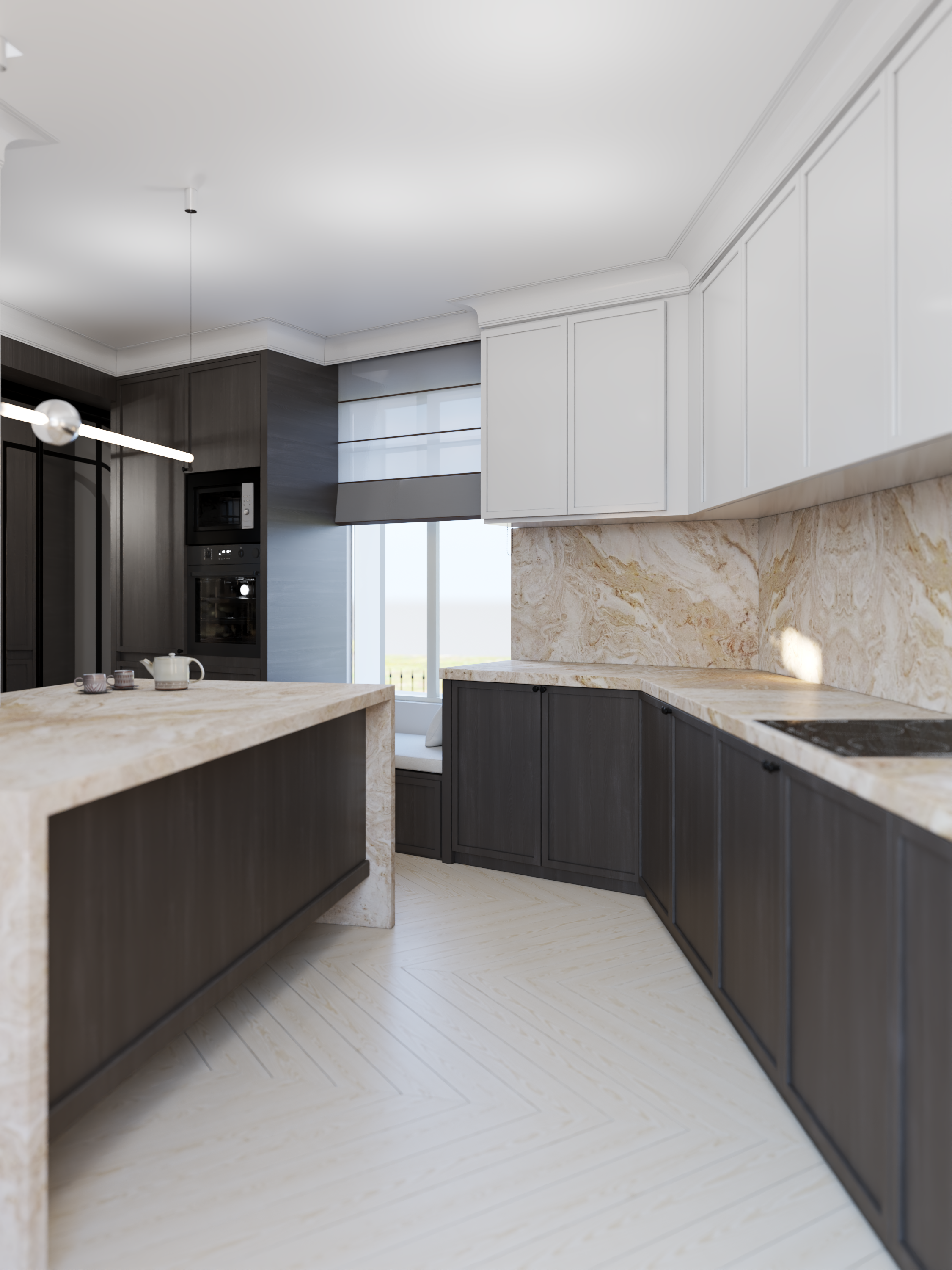 enhance the photo realistic texture and morning lighting set the interior lighting of the kitchen with soft white artificial lighting setting under and upper of the cabinet enhance the realistic texture and dawn lighting with interior lighting turned on with soft light set the camera focus into f 35 focus on the table set